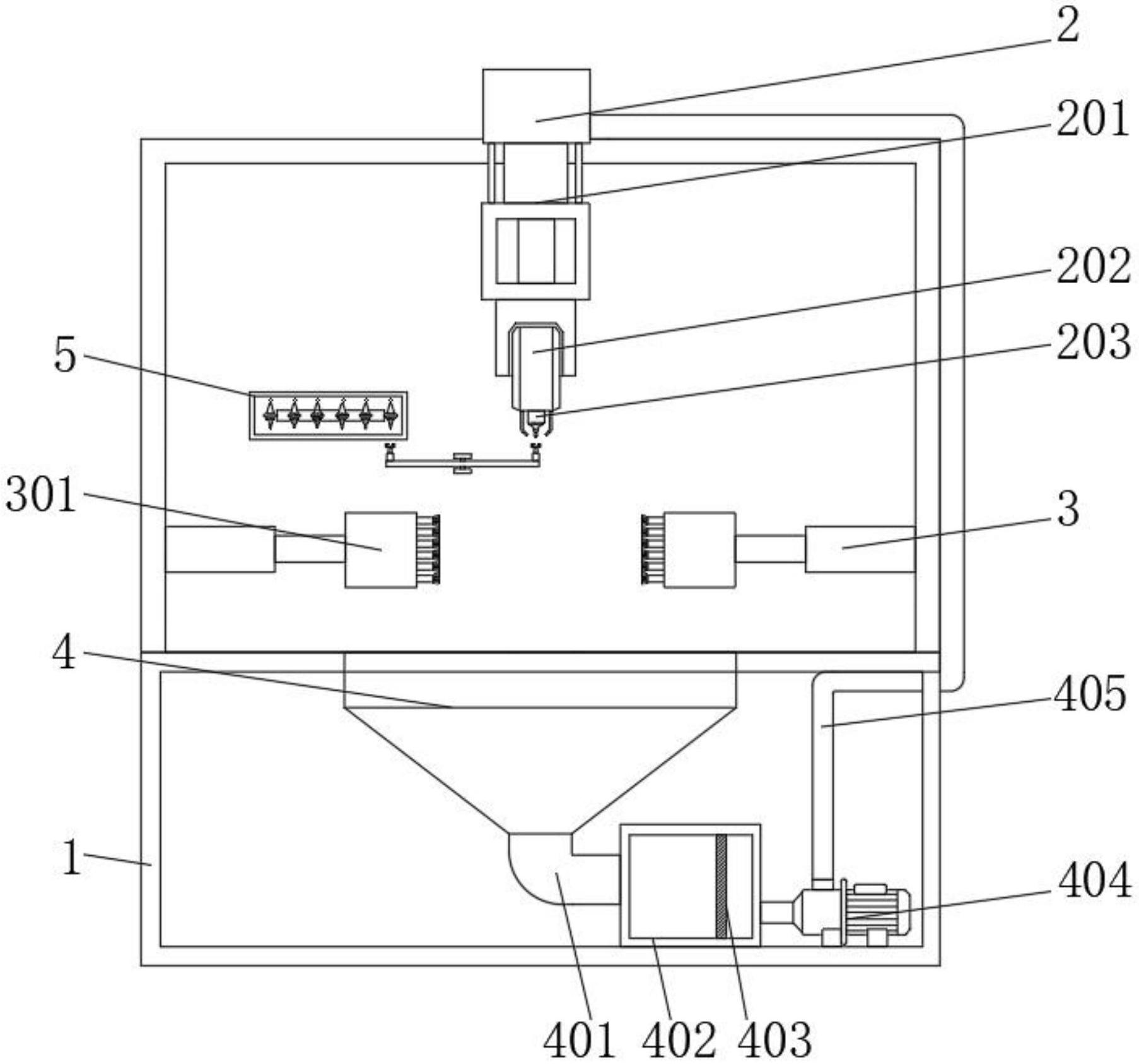 本实用新型公开了一种自适应铸件精雕机用打磨装置,包括底座和收纳盒,所述底座的顶部安装有工作区,所述工作区的顶部贯穿安装有雕刻器,所述工作区的两侧内壁上安装有侧面伸缩杆,所述侧面伸缩杆的一端安装有打磨装置,所述底座的顶部贯穿安装有漏斗,所述工作区的后端内壁上安装有收纳盒。本实用新型通过在侧面伸缩杆的一侧安装有打磨装置,打磨装置的内部安装有电动机,电动机的输出端安装有外衬,外衬的内部通过弹簧安装有固定杆,固定杆的一端安装有打磨头,当侧面伸缩杆伸长时,打磨头接触到金属铸件,然后弹簧顺着铸件表面的形状进行收缩,然后自适应铸件的形状,然后电动机启动,带动打磨头的转动从而对金属铸件表面进行打磨。
