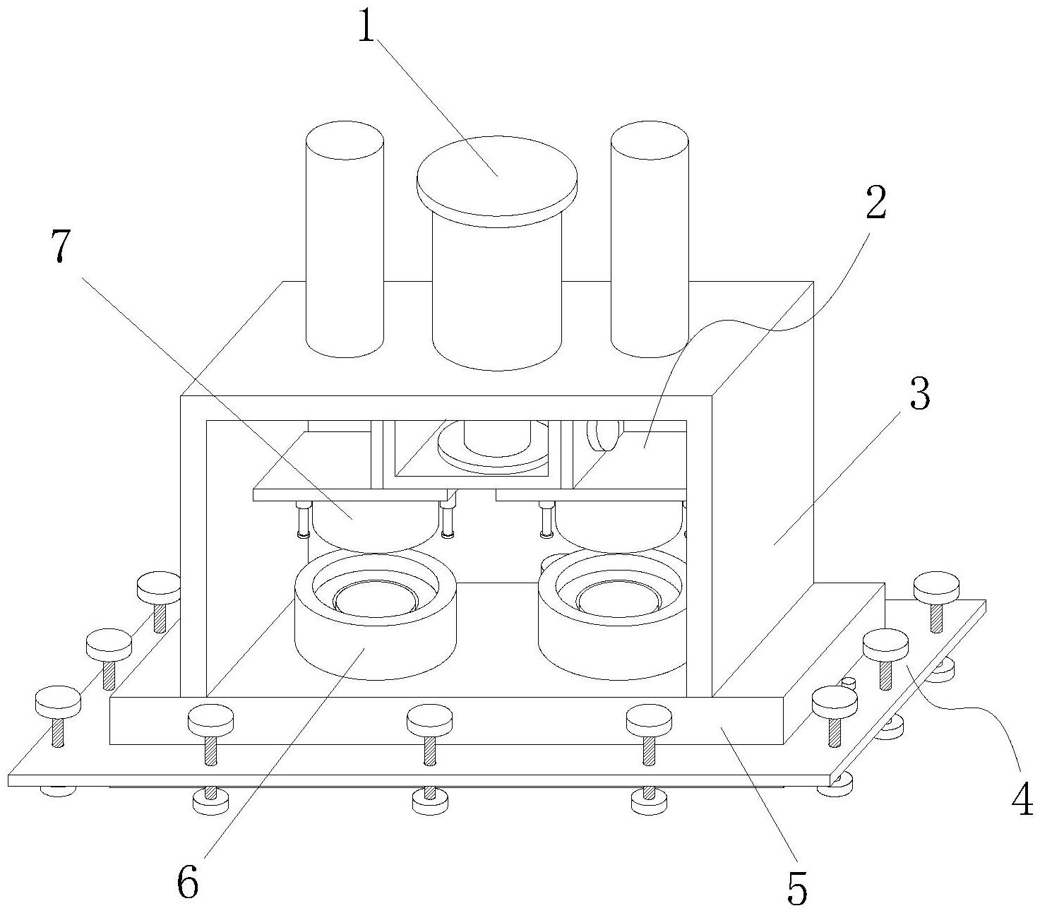 本实用新型公开了一种高速双工位模具,属于模具技术领域,包括底板,所述底板的上方安装有龙门支架,龙门支架的上方安装有液压缸,龙门支架的内侧设置有两个上模组件,底板上与两个上模组件相对应的位置安装有下模组件,液压缸与两个上模组件之间通过驱动连接装置进行连接;本实用新型通过设置驱动连接装置,使得工作人员能够根据工作的需要选择是否令两个上模组件一同升降,从而更好地满足不同情况时的工作需要,进而提高了模具的实用性;本实用新型通过设置稳定支撑装置,使得工作人员能够在需要的时候通过调节各个支撑板来令模具在凹凸不平的平面上保持平衡,从而保证了模具的正常工作,进而提高了模具的稳定性。