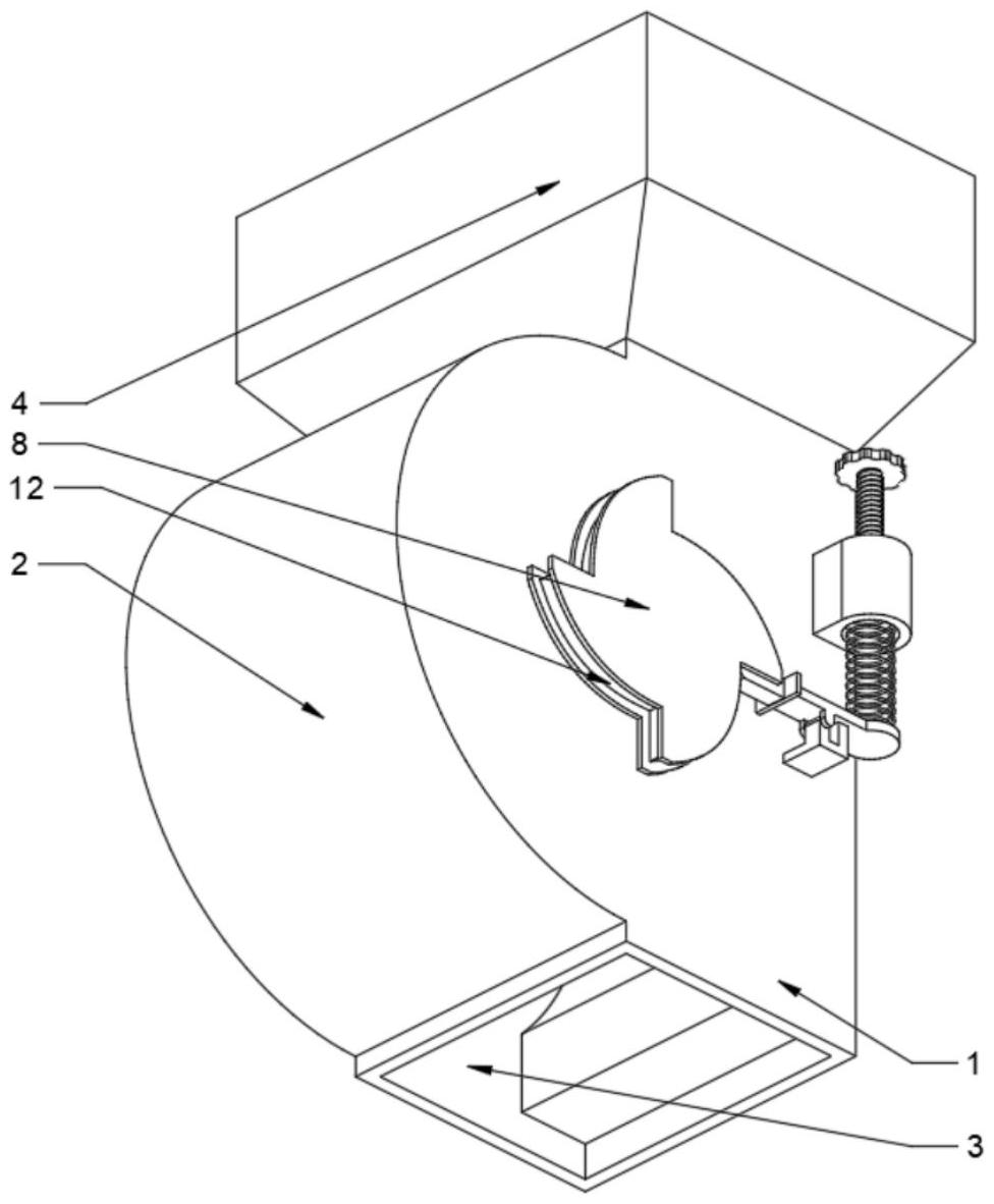 本实用新型涉及食品生产相关技术领域,公开了一种食品生产用称重装置,包括落料管,落料管底部设置有出料口,落料管顶部固定连接有加料斗,所述落料管一侧设置有转动箱,转动箱内转动连接有转轴,转轴上固定连接有四组均匀分布的挡板,挡板由转轴向挡板的边缘呈斜坡设置且角度逐渐降低,所述转轴一端穿过转动箱固定连接有棘轮,棘轮上棘齿数量与挡板数量相同,本实用新型通过弹簧与棘轮的相互配合实现了对食品的自动称量并实现了自动下料,并且装置可根据食品的种类的不同以及包装规格的不同对装置的称量质量进行调节,无需工人反复称量,降低了人工成本,降低了人工成本,加快的生产效率,提高了称量精度,提升了装置的实用性。