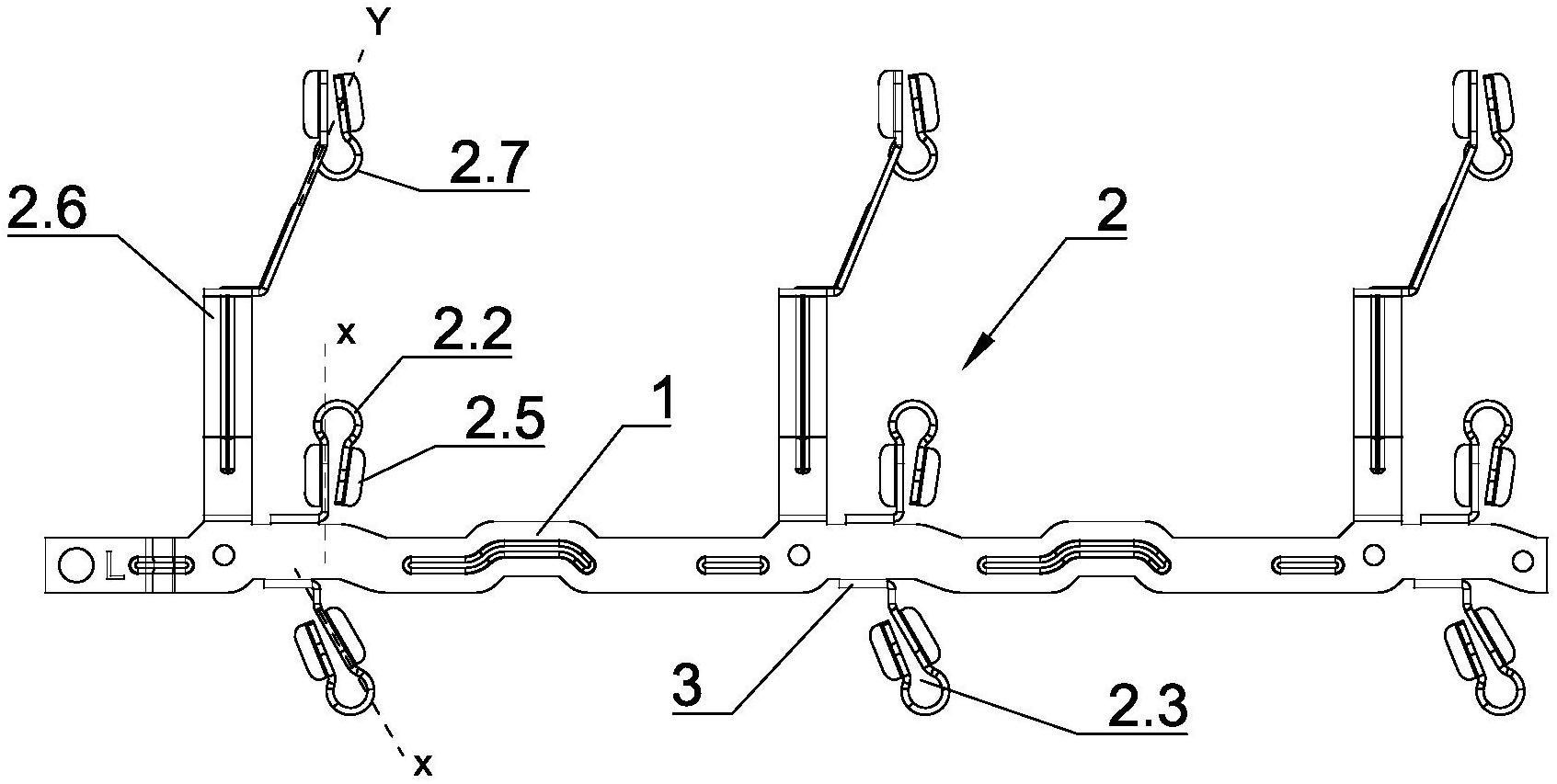 本实用新型公开了一种双排插座导电片结构,包括金属连接件,金属连接件设置有至少一组插接套组件,接插接套组件包括与金属连接件相连接的分支连接件和连接部,所述连接部两端均设置有主金属插套,主金属插套开设有夹持缝,主金属插套沿垂直夹持缝的剖面为弧状,且该弧状的剖面位于连接部的延长线两侧,夹持缝均朝向连接部,分支连接件远离金属连接件的一端设置有与主金属插套相同的副金属插套;该主金属插套自身具有较强的抗形变能力,能够更加可靠的夹紧插脚,该主金属插套位于连接部或其延长线的两侧,使得主金属插套具有更强的夹持力有效节省加工材料降低成本。