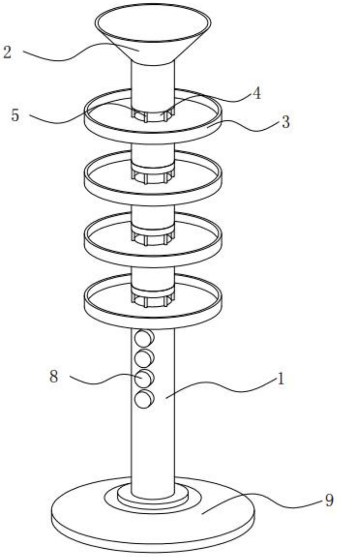 本实用新型提供一种基于咖啡豆烘焙干燥处理后的冷却装置。所述基于咖啡豆烘焙干燥处理后的冷却装置包括:落料套管,所述落料套管的顶部固定连接有用于咖啡豆落入到落料套管内部的落料斗,所述落料套管外表面的不同高度固定连接多个用于咖啡豆冷却的环形冷却盘,所述落料套管的表面且位于所述环形冷却盘的上方开设有用于咖啡豆从落料套管内部落入到冷却盘中的出料口。本实用新型提供的基于咖啡豆烘焙干燥处理后的冷却装置通过在落料套管上设置的多个冷却盘,提升空间的利用率,并且通过电动伸缩杆带动锥形块的上升和下降,即可将咖啡豆输送到不同高度冷却盘上方时,无需手动倾倒咖啡豆,提升咖啡豆冷却的自动化程度。