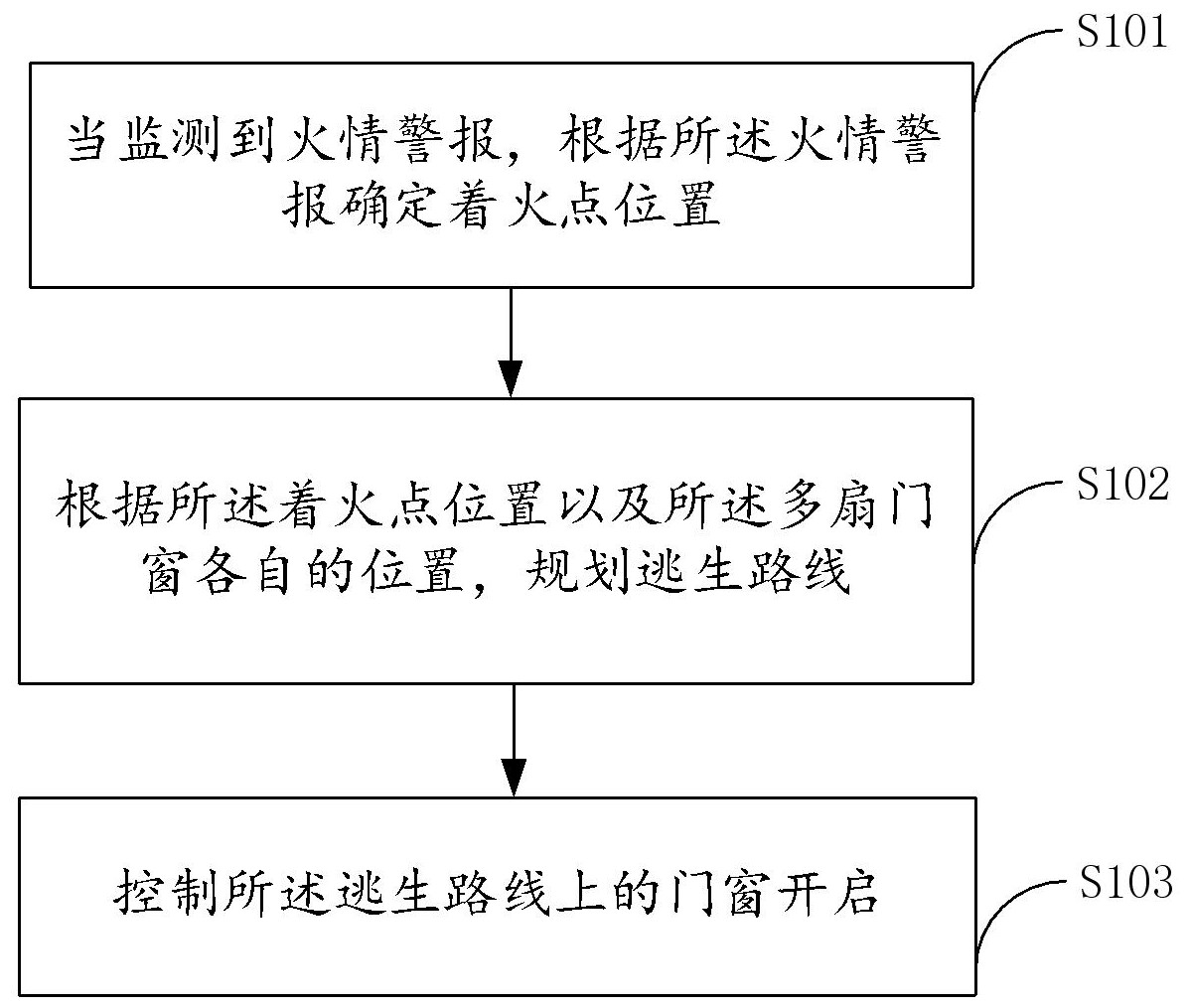 本申请适用于智能家居技术领域,提供了一种门窗控制方法、终端设备及计算机可读存储介质,应用于门窗系统,所述门窗系统包括多扇门窗,所述方法包括:当监测到火情警报,根据所述火情警报确定着火点位置;根据所述着火点位置以及所述多扇门窗各自的位置,规划逃生路线;控制所述逃生路线上的门窗开启。通过上述方法,能够在出现火情时,为室内人员提供安全的逃生通道,提高建筑物内人员的安全。