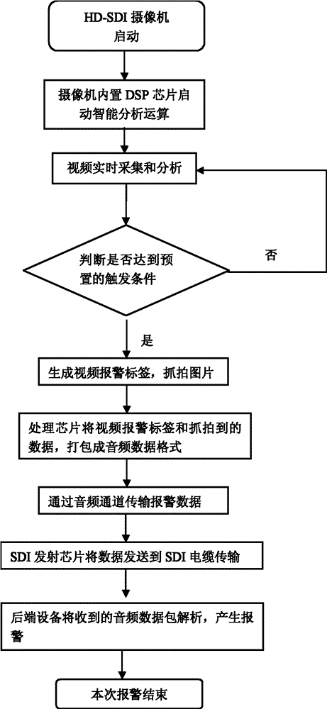 公开了一种无需添加新的数据传输接口、信号不会丢失的HD-SDI摄像机传输智能分析数据的方法,包括步骤:(1)利用摄像机的ISP芯片或者DSP芯片实时进行视频分析;(2)当达到指定阀值时,就会触发报警,此时摄像机将智能分析数据或抓拍的图像截图通过摄像机的音频传输通道发送到后端服务器。
