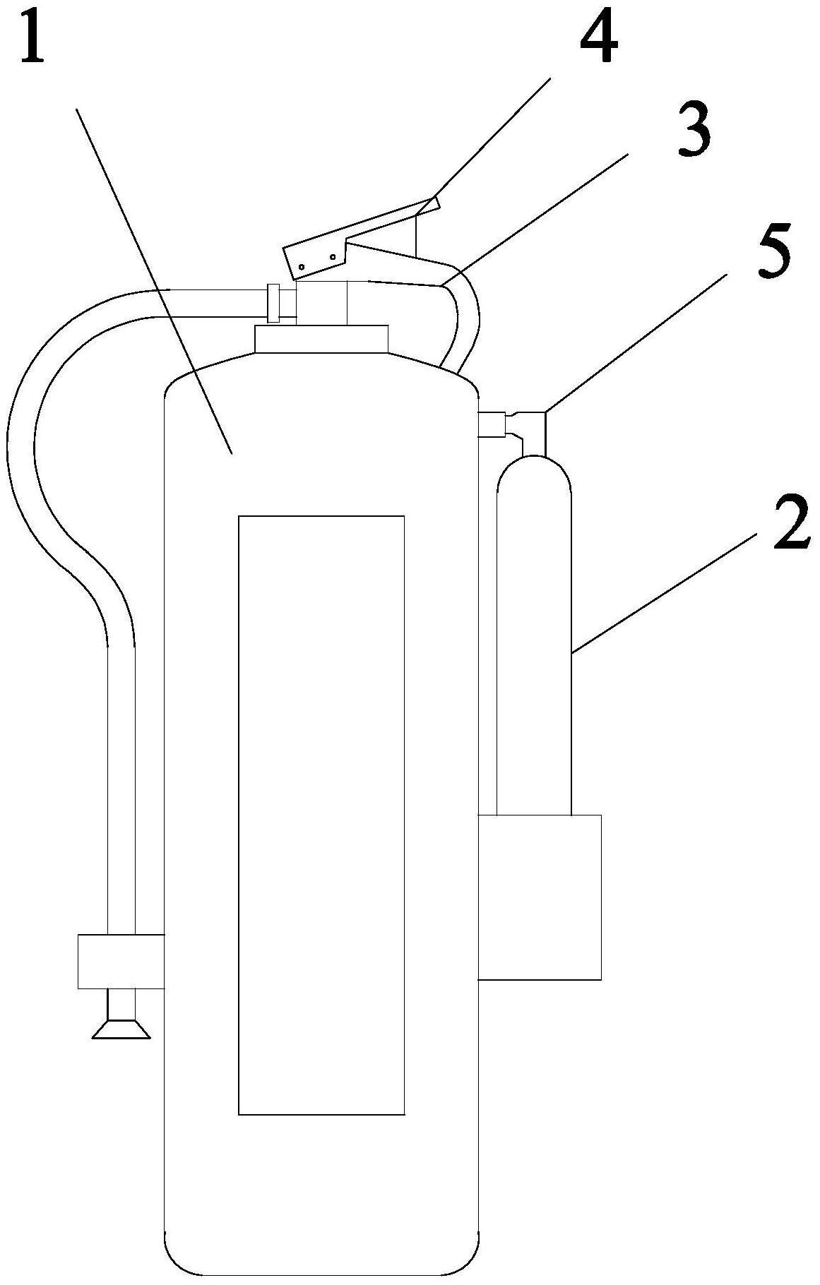 本实用新型公开了一种外置贮气瓶式手提灭火器,属于灭火器领域,包括筒体、贮气瓶、把手、按压式开关,所述筒体与所述贮气瓶的连接处设有贮气阀门结构,所述贮气阀门结构包括位于所述贮气瓶上的出气头和位于所述筒体上的进气头,所述贮气阀门结构包括与固定在出气口中的阀芯和固定在进气口上的气芯,所述进气头和出气头之间通过密封螺母连接;通过将贮气瓶设置在筒体外侧,解决了现有技术中贮气瓶气压不便于检查,导致放置在场所中的灭火器不可靠的问题。