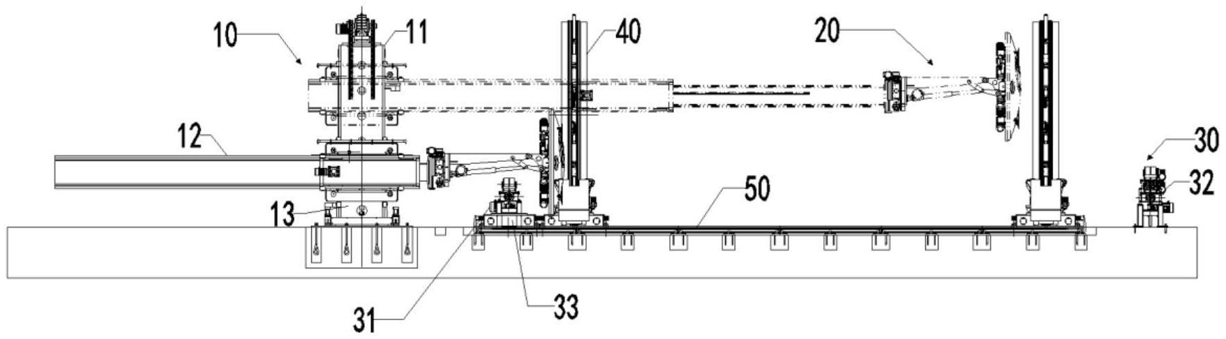 本实用新型公开了一种液罐车防浪板装配机,包括:十字架操作机、防浪板抓取机构、滚轮架和抱圆工装;所述十字架操作机包括立柱和可伸缩的横梁,所述立柱的底部设有电动回转机,所述横梁通过提升机构设于所述立柱上,所述防浪板抓取机构设于所述横梁的端部,所述滚轮架包括移动滚轮架和固定滚轮架,所述移动滚轮架设于所述十字架操作机和固定滚轮架之间,所述抱圆工装设于所述移动滚轮架和固定滚轮架之间,所述移动滚轮架和抱圆工装均设于行走轨道上。本实用新型大大提高了工件的组对质量、减少了组对时间、减轻了工人的劳动强度。