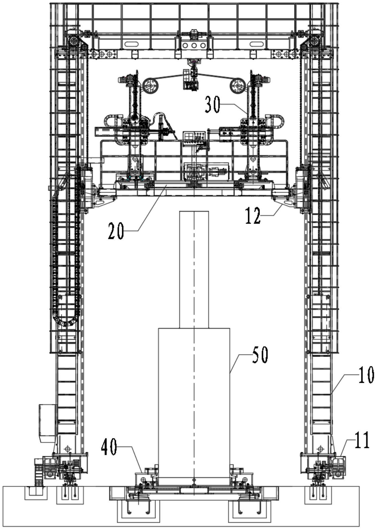 本实用新型公开了一种大型电渣重熔炉电极焊接装置,包括龙门式操作机、回转平台、焊接操作机和工件底座;所述龙门式操作机底部设有行走台车,所述工件底座设于龙门式操作机的行走路轨中间,工件底座用于固定待焊接的工件,所述回转平台设于所述龙门式操作机上,且所述回转平台可沿龙门式操作机上下滑动,所述焊接操作机设于所述回转平台上,所述回转平台呈环状结构,使所述工件的顶部可穿过所述回转平台;本实用新型减少了辅助工装的投入,从而降低了成本。