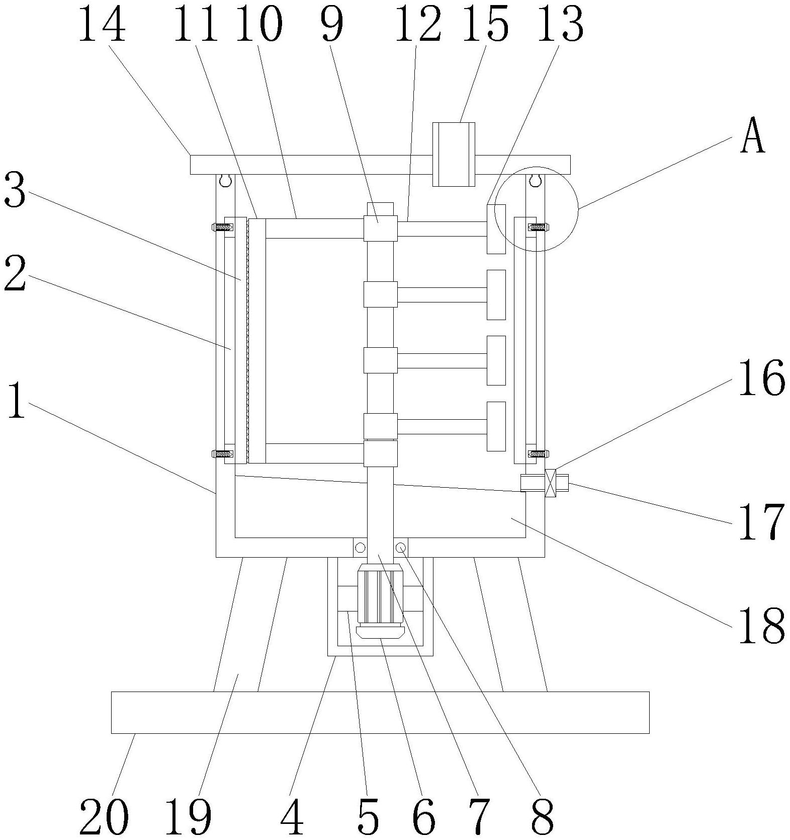 本实用新型公开了陶瓷砖粘结剂生产防凝固装置,其技术方案要点是,设置搅拌同时进行加热,用于解决现有的陶瓷砖粘接剂在生产过程中出现凝固的问题以及凝固后的附着导致的出料困难等问题,并且针对内部加热结构的拆卸也做出了优化;通过机壳、加热板、导热板、电机、转轴、轴承、转子、第一支撑板、刮板、第二支撑板、搅拌叶、进料管、出料阀、出料管和导料板,可以达到该装置防凝固效果好的作用,通过对于内部搅拌过程中的粘结剂进行加热以防其出现凝固问题,并且在提供防凝固的作用的同时可有效的防止内部附着的粘结剂被刮除,避免因残留导致后续的一系列问题,满足了人们的使用需求。