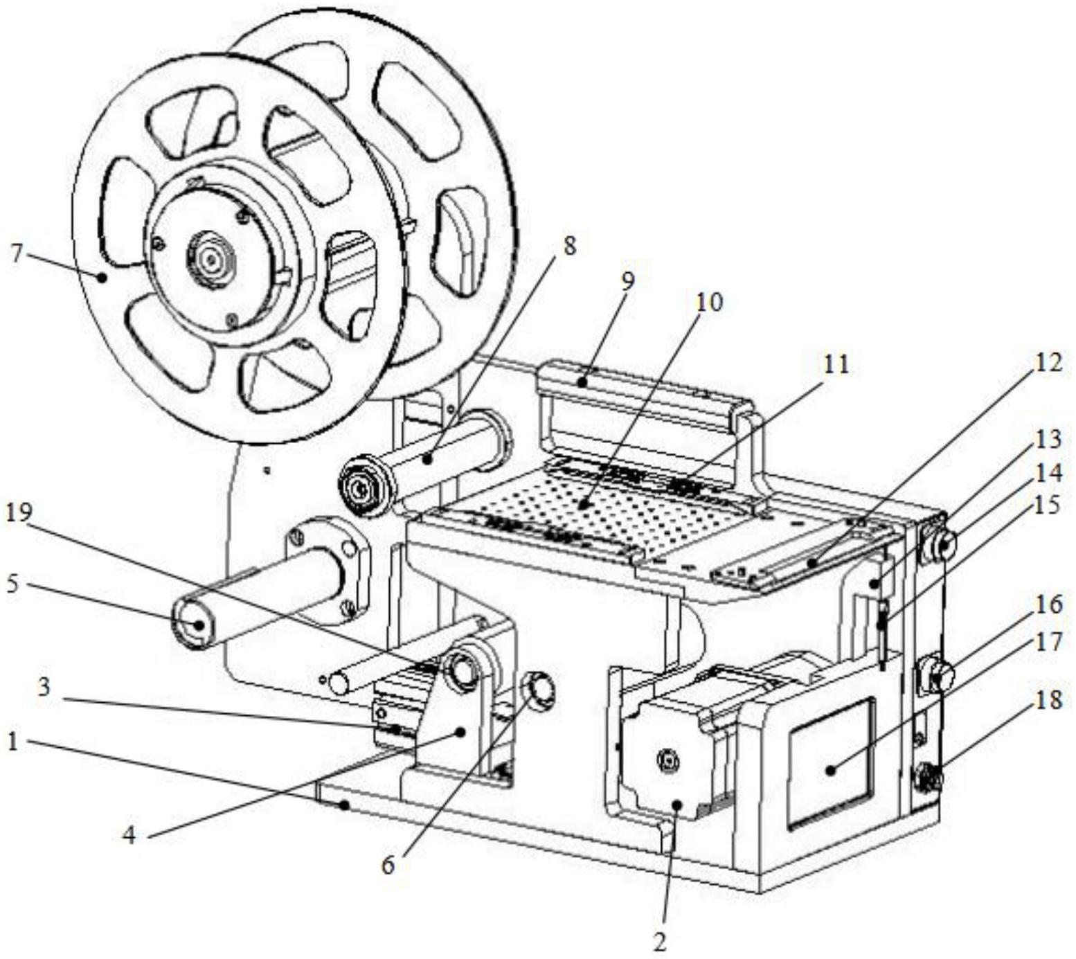 本实用新型涉提供了一种用于剥离车灯透气膜的装置,包括架体、轮盘和剥刀,架体上设有放置平台,轮盘安装于放置平台的一侧,剥刀安装于架体远离轮盘的一侧,架体上还安装有底膜回收轴和电机,电机安装于放置平台的底部,底膜回收轴安装在架体上,且位于轮盘的下方,底膜回收轴与电机的输出轴通过皮带连接。本申请通过将整圈粘贴有透气膜的底膜套设到轮盘上,然后将剥离透气膜后的底膜通过电机带动底膜回收轴转动,底膜在经过剥刀时,透气膜被剥刀从底膜上剥离。底膜上同一排粘贴有很多个透气膜,因此,通过本申请的装置可以一次性剥离多个透气膜,提高效率;且在剥离过程中不会使得透气膜褶皱,也不会由于汗液油污等污染透气膜影响其性能。