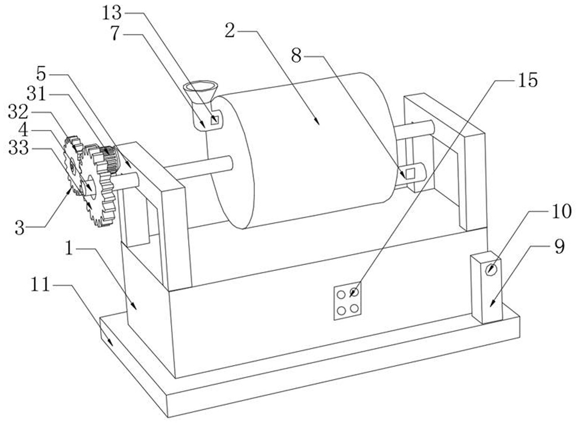 本实用新型公开了一种电玉粉生产加工用新型球磨机,涉及球磨机技术领域,包括安装罩和底板,底板设置在安装罩的底部,安装罩顶端的两侧均固定设有U型架,两个U型架之间设有筒体,筒体两侧的中部均固定设有支撑轴,其中一个支撑轴的一端与其中一个U型架的顶部转动穿插连接,另一个支撑轴的一端转动插入另一个U型架一侧的顶部,本实用新型的有益效果是:通过设置的驱动电机的输出轴带动小齿轮进行转动,小齿轮通过大齿轮带动其中一个支撑轴进行转动,两个支撑轴通过与两个U型架相配合带动筒体进行转动,与设置的若干个磨料球相配合,便于更好的进行物料粉碎加工,提高了电玉粉生产加工用新型球磨机的工作效率和实用性。