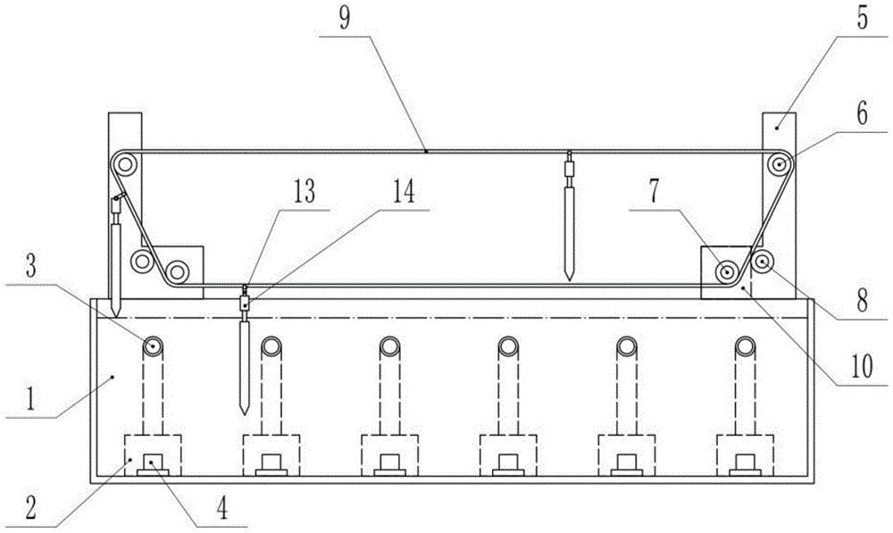 本实用新型公开了一种宝剑加工用淬火装置,包括:长方体淬火池体,淬火池体内通过多个循环泵设置有多个进液口和出液口;传动架,传动架由设置于淬火池同一侧两端的两墙板、上传动轮、下传动轮、张紧轮、传动带以及变速电机组成,上传动轮设置下传动轮外侧,各上传动轮、下传动轮上设有齿轮,两下传动轮中的一个与变速电机的输出轴相连接,传动带的内端设有齿纹并与各齿轮相啮合,传动带的侧面具有一圈凸起,凸起上等距离设置有挂孔,两张紧轮分别设置于两下传动轮一侧并紧贴传动带外端;挂钩,挂钩通过转轴连接有一固定部,本实用新型无需铁匠手持剑胚进行淬火,且淬火效果佳。