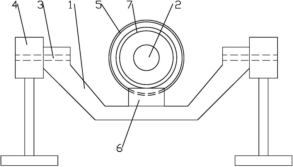 本实用新型公开了一种无缝钢瓶瓶底球面收口机,包括U型翻板、轴A、轴B、基座、夹持套筒、抵块、驱动装置,所述U型翻板两端通过所述轴B与所述基座连接,所述U型翻板与所述轴B固定,所述轴A与所述U型翻板呈空间垂直位姿,所述轴A与所述夹持套筒连接,无缝钢瓶固定在所述轴A与所述夹持套筒之间,所述抵块固定在所述U型翻板的凹面上,所述轴A、所述轴B通过所述驱动装置带动运转,所述U型翻板翻转使所述抵块作用于无缝钢瓶的端面。本实用新型的优点是构造简单,无缝钢瓶旋转和U型翻板翻转相配合,对高温加热接近熔点的无缝钢瓶端面推挤得到闭合的球面瓶底,得到的产品尺寸、形态一致,提高了产品质量和生产效率。