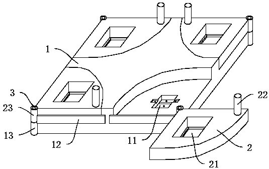 本实用新型涉及一种焊接夹具,包括:大体呈方形的底座,底座的角部设有第一轴套;转动座,转动座大体呈直角扇形,其角部设有与第一轴套匹配的第二轴套;转轴,转轴穿过第一轴套和第二轴套从而将底座和转动座铰接;转动座设有第一定位槽,第一定位槽上下贯穿转动座;底座对应第一定位槽的位置设有第二定位槽,转动座转动至与底座重合的位置时,第一定位槽和第二定位槽上下对置。本实用新型通过底座与转动座铰接配合,在转动座的第一定位槽和底座的第二定位槽分别放置待焊接工件,转动转动座即可对待焊接工件进行上下定位,其操作简单,定位准确,且可同时对四个工件进行定位焊接,有效提高了焊接的效率。