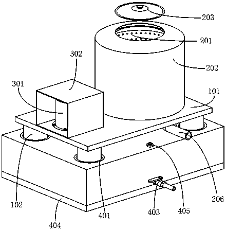 一种红枣浓缩汁的获取装置,包括机架、离心装置、驱动装置、减震装置,所述离心装置和所述驱动装置设置在所述机架上,机架的下端与减震装置连接;所述机架包括支撑板、四条支撑腿,所述支撑板的下表面与所述四条支撑腿固定连接,离心装置和驱动装置设置在支撑板上;所述减震装置的上表面设置四个定位孔,以使支撑腿嵌入所述定位孔中,定位孔的深度大于支撑腿的长度,本实用新型的减震装置通过增加红枣浓缩汁的获取装置的底部的质量,使红枣浓缩汁的获取装置的重心下移,从而使红枣浓缩汁的获取装置更加稳定,减小了红枣浓缩汁的获取装置自身的振动。