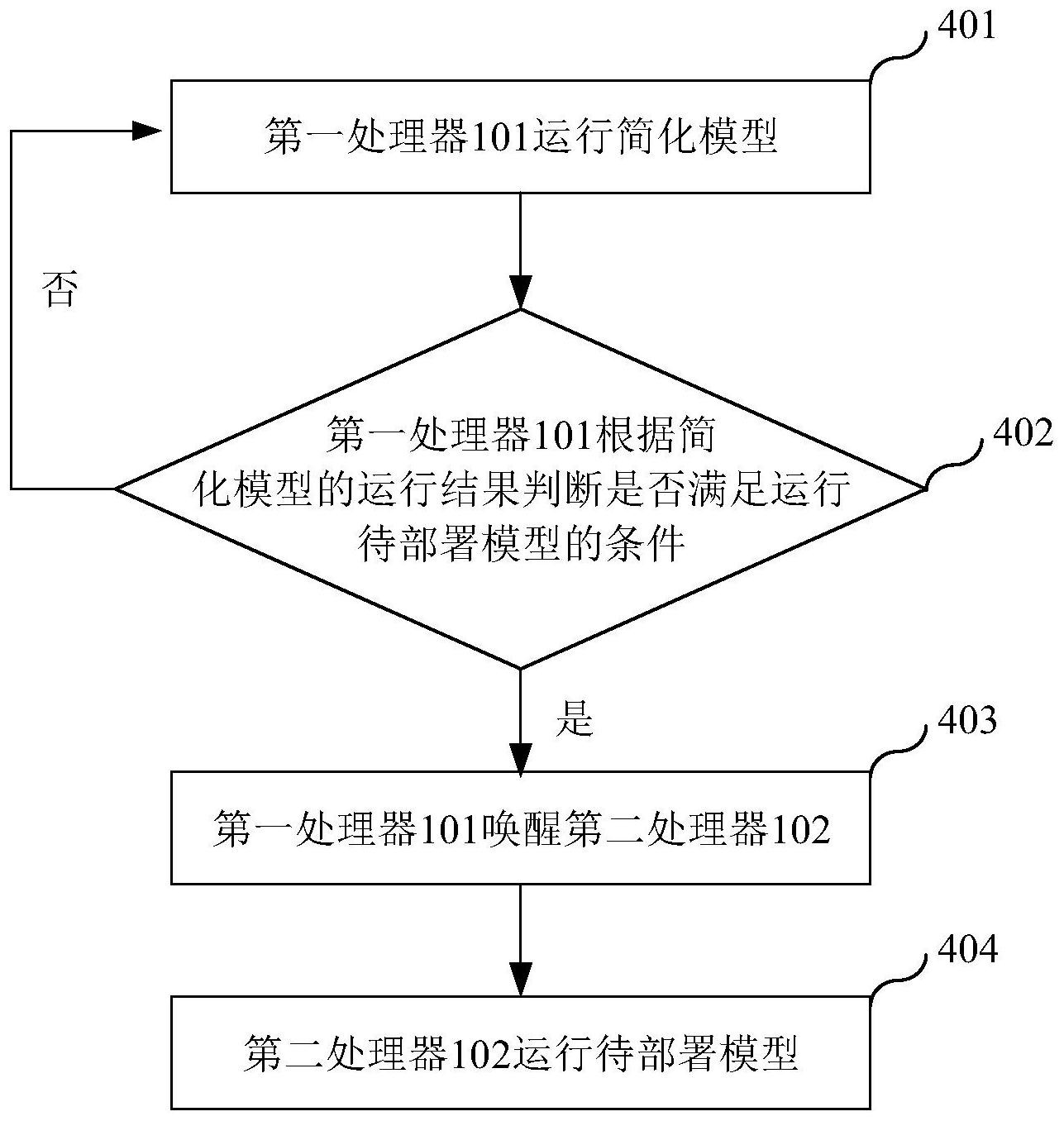 本申请涉及电子技术领域,公开了一种电子设备及其神经网络模型运行方法、存储介质。该电子设备包括第一处理器和第二处理器,上述方法包括:第一处理器运行简化模型并根据简化模型的运行结果判断是否满足神经网络模型的运行条件;第一处理器在简化模型的运行结果满足神经网络模型的运行条件的情况下,唤醒第二处理器运行神经网络模型;其中,简化模型为通过下列中的至少一种方式将神经网络模型简化得到:减少所述神经网络模型的输入参数;简化所述神经网络模型的网络结构。如此,第二处理器只在简化模型的运行结果满足神经网络模型的运行条件时才被唤醒并运行神经网络模型,降低了第二处理器的功耗,提升了电子设备的续航能力。