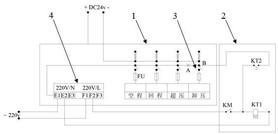 本实用新型公开了一种六面顶电气机卸压控制阀组保护系统,包括阀电源输出转接板与卸压电控保护开关,所述电源输出转接板上设置有卸压电磁阀与阀电源,所述卸压电磁阀与所述阀电源之间设置所述卸压电控保护开关,所述卸压电控保护开关包括KM加热交流接触器、KT1时间继电器与KT2时间继电器,本六面顶电气机卸压控制阀组保护系统,通过卸压电控保护开关来控制卸压工步的启停,当控制电脑死机或程序异常而提前发出卸压指令时,不会出现卸压电磁阀带电而启动卸压工步的情况,提供了有效的卸压保护,解决了异常卸压造成的高压放气炮,控制方式更加合理,可靠性高,操作简便,更适合于六面顶压机电气控制系统的卸压控制。