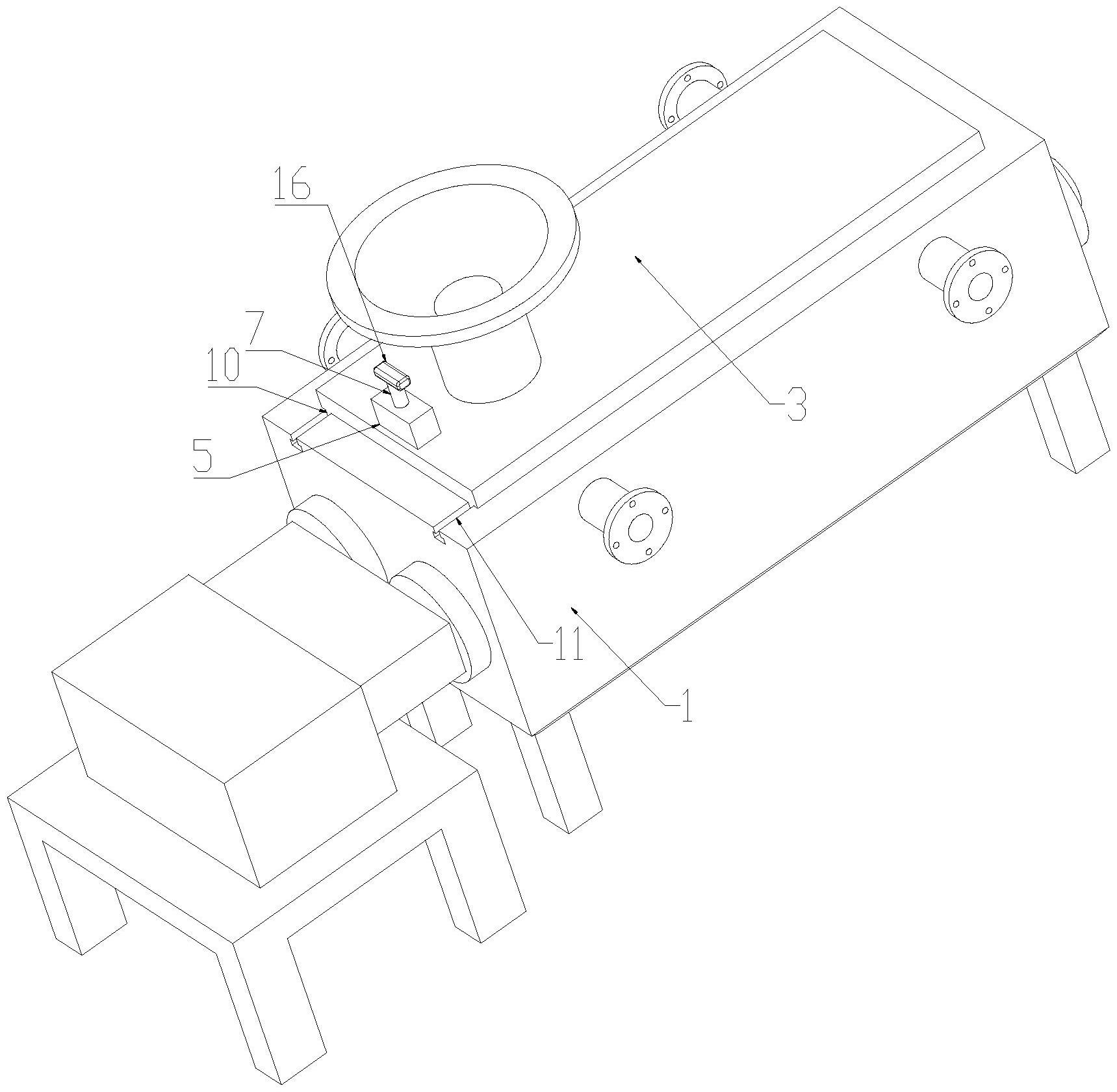 本实用新型涉及桨叶式干燥机技术领域,具体为一种便于拆装顶盖的桨叶干燥机,包括桨叶干燥机本体,所述桨叶干燥机本体的顶端开设有开槽,所述开槽连通所述桨叶干燥机本体的内部,所述桨叶干燥机本体的顶端设有顶盖,所述顶盖与所述桨叶干燥机本体之间设有密封机构、导向机构以及紧固机构,所述紧固机构包括对接孔以及紧固块,所述导向机构包括导向块以及导向槽,通过紧固机构以及导向机构便于人员将顶盖从桨叶干燥机本体上拆下,从而人员通过开槽对桨叶干燥机本体的内部进行清洗作业,人员能够通过开槽直接观察桨叶干燥机本体内部的结构,而且能够便于人员直接对桨叶干燥机本体的内部进行清洗,从而能够提高清理效率。