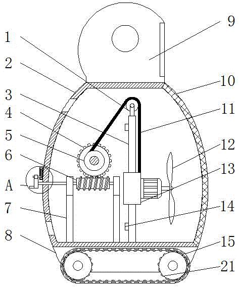 本实用新型公开了一种带风扇的儿童科技创新教育机器人,包括壳体和教育装置,所述教育装置位于壳体的上端,所述壳体的下端固定连接有底座,所述底座的内部设有移动装置,所述壳体的下内侧壁竖直固定连接有矩形杆,所述矩形杆的杆壁活动滑动有滑块,所述滑块的一侧固定连接有风扇,所述矩形杆的上端固定连接有定滑轮,所述壳体的内部位于滑块远离风扇的一侧设有绕线轮,所述绕线轮通过第一转杆与壳体的内侧壁转动连接,所述绕线轮的侧壁固定连接有绳索,所述绳索的另一端穿过定滑轮并与滑块的上端固定连接。本实用新型不易翻倒,从而不易砸伤儿童,提高了安全性,能够对儿童散热,且可调节高度,适应不同高度的儿童。
