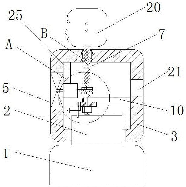 本实用新型公开了一种带风扇的儿童益智机器人,包括底座,底座的上侧中心处固定连接有连接块,连接块的上方设有机器人本体,机器人本体的底部固定设有轴承,且机器人本体内设有空腔,连接块的上端穿过轴承并向机器人本体内延伸,连接块固定转动连接在轴承内,机器人本体内的一侧竖直固定连接有固定杆,固定杆另一端固定连接有驱动电机,驱动电机为两端输出,驱动电机的输出端固定连接有内嵌在机器人本体上的风扇,驱动电机另一个输出端通过联轴器固定连接有蜗杆,机器人本体的顶部贯穿设置有拉杆,拉杆通过滑动机构与机器人本体滑动连接。本实用新型使得风扇能够一边转动,一边左右摆动,且能够很好地控制风扇左右摆动。