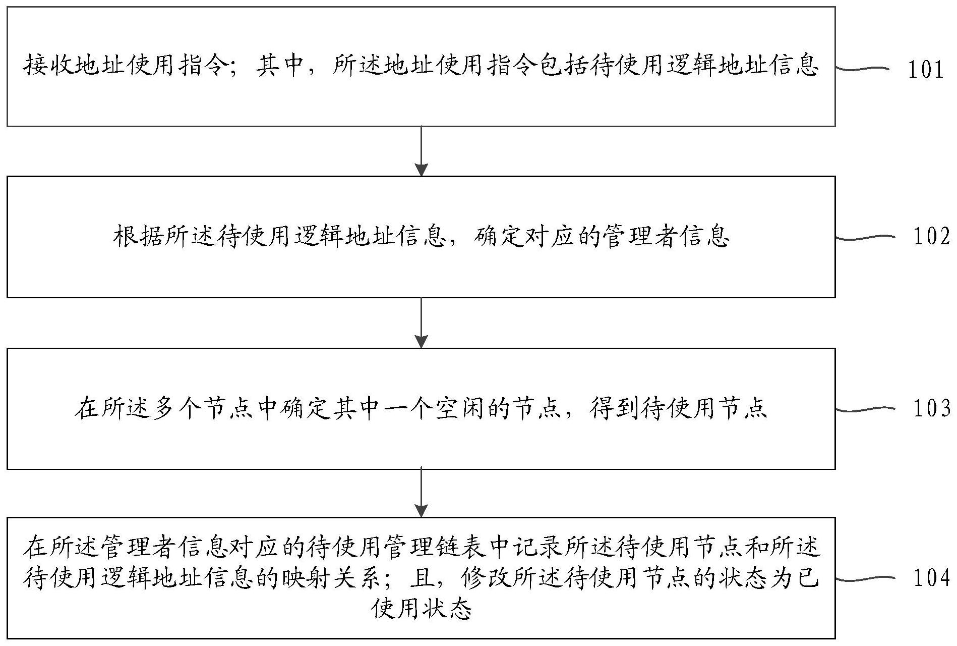本发明实施例提供了一种存储空间管理方法及装置,该方法包括接收地址使用指令;其中,所述地址使用指令包括待使用逻辑地址信息;根据所述待使用逻辑地址信息,确定对应的管理者信息;在所述多个节点中确定其中一个空闲的节点,得到待使用节点;在所述管理者信息对应的待使用管理链表中记录所述待使用节点和所述待使用逻辑地址信息的映射关系;且,修改所述待使用节点的状态为已使用状态。本发明实施例中各管理者信息对应的管理链表中的节点数量是不确定的,是根据实际的地址使用情况设置的,避免出现因节点不够用而导致的存储空间无法使用等现象,大大提升了存储空间管理的灵活性。