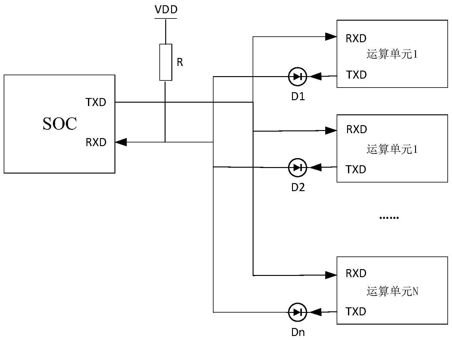 本公开公开了一种运算系统及相应的电子设备,所述运算系统包括所述运算系统包括运算板电路和控制板电路,其中:所述运算板电路包括两个或两个以上运算单元,控制板电路包括系统级芯片SOC,所述系统级芯片SOC和所述两个或两个以上运算单元分别具有数据接收端口和数据发送端口;所述系统级芯片SOC的数据发送端口和所述两个或两个以上运算单元的数据接收端口分别相连,所述系统级芯片SOC的数据接收端口和所述两个或两个以上运算单元的数据发送端口分别相连,所述相连采用通用异步收发器UART串行总线协议进行数据通信。本公开实现了在电路板上使用通用异步收发器UART串行总线协议进行数据通信的一对多通信方式。