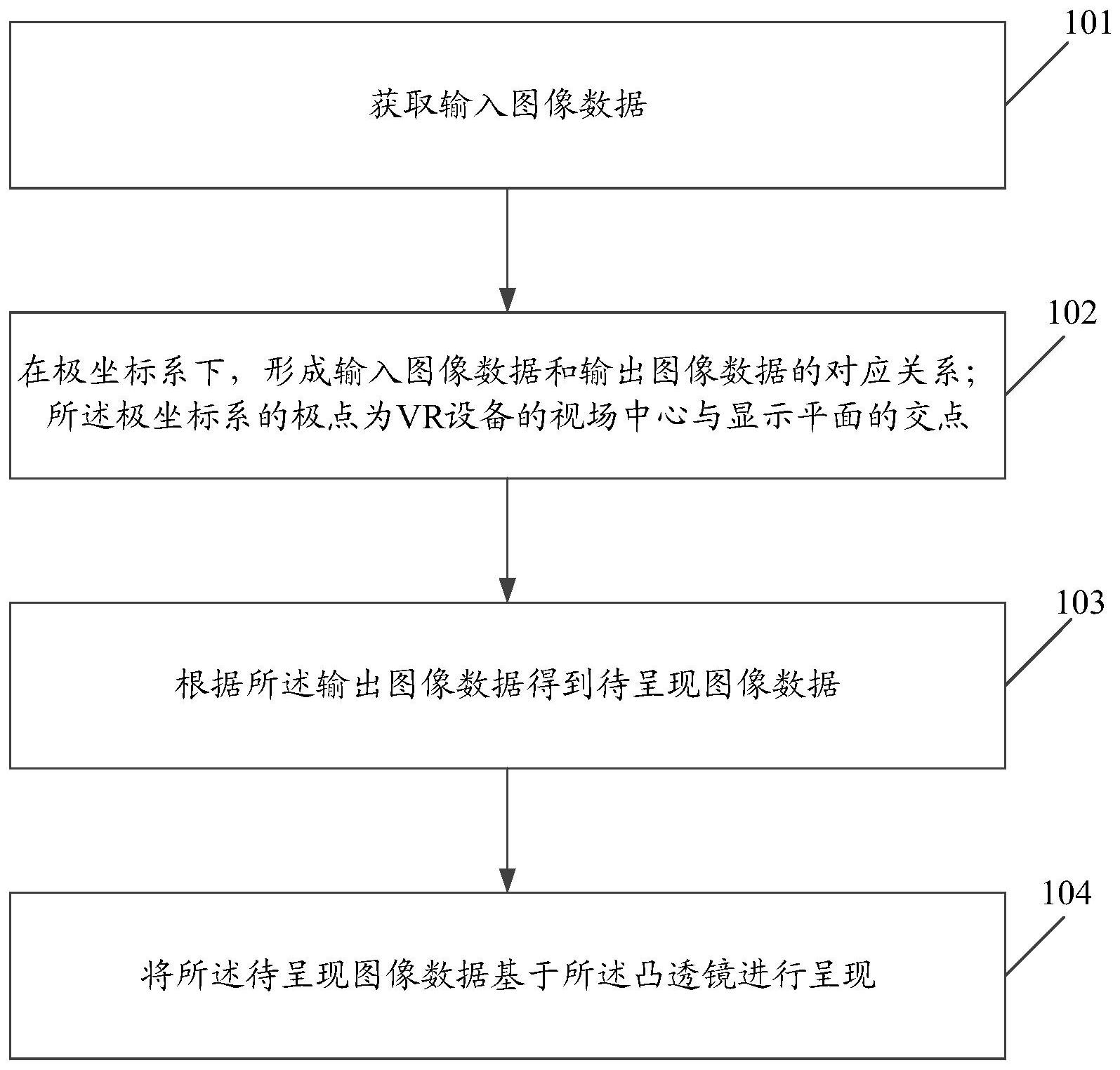 本发明实施例提供了一种VR设备的图像呈现方法、装置、设备和计算机存储介质,所述方法包括:获取输入图像数据;在极坐标系下,形成输入图像数据和输出图像数据的对应关系;所述极坐标系的极点为虚拟现实VR设备的视场中心与显示平面的交点;根据所述输出图像数据得到待呈现图像数据;将所述待呈现图像数据基于所述凸透镜进行呈现。