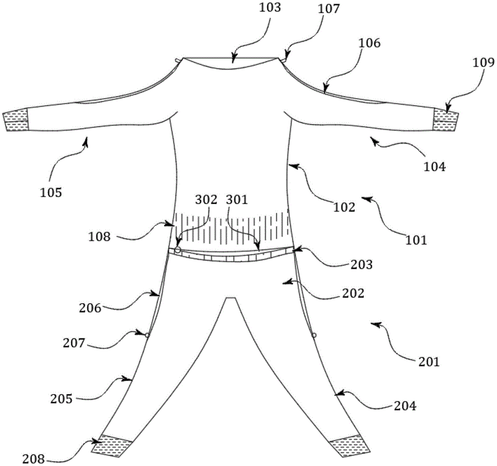 本实用新型涉及童装技术领域,特别涉及一种婴幼儿连体衣,包括上衣和下衣,上衣和下衣连为一体;上衣具有本体,本体上具有领口、左衣袖和右衣袖;下衣具有裤体,裤体具有裤腰以及与裤腰连接的左裤腿和右裤腿;上衣沿领口至左衣袖和右衣袖均开设有袖开口,下衣沿裤腰至左裤腿和右裤腿均开设有裤开口,上衣与下衣后侧连接为一体,上衣与下衣前侧的连接处具有横向设置的腰开口,裤开口上部与腰开口左右两侧相接。该连体衣方便穿脱,不仅改善了由于婴幼儿好动导致穿衣不便的问题,也避免了普通衣服穿戴不便造成的婴幼儿哭闹的发生;同时也能方便更换尿不湿,防风保暖。