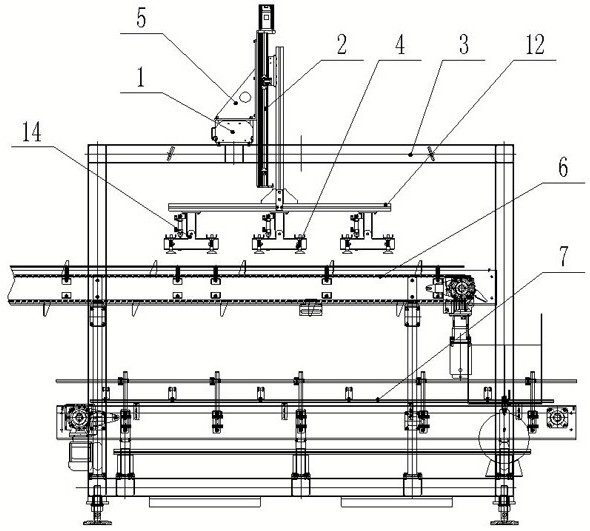 本实用新型公开了一种取放手提袋装置,属于后包装技术领域,包括机架,所述机架的上部设有X轴模组,所述X轴模组可沿X轴方向移动;所述X轴模组的滑动部上安装有Z轴模组;所述Z轴模组可沿Z轴方向移动;所述Z轴模组的滑动部上通过固定架安装有多个吸盘组件;所述机架上安装有平行间隔设置的输手提袋链道和输箱链道;所述输手提袋链道的侧部还设有来手提袋检测光电,所述手提袋检测光电与控制系统连接;本实用新型可以实现自动放手提袋动作,降低劳动强度,提高生产效率,降低人工成本。
