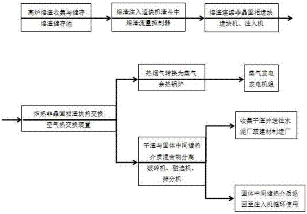 本实用新型公开了一种高炉熔渣固体介质换热回收和综合成套装备,首先将高炉排出的高炉熔渣收集与存储,然后控制所述高炉熔渣流量,再将所述高炉熔渣与固体中间储热介质混合,从而形成混合有所述固体中间储热介质的具有一定非晶玻璃体含量的热态渣块,通过空气热交换装置冷却所述热态渣块,形成热烟气和冷态渣块,所述热烟气转化为热蒸汽来发电。所述冷态渣块通过破碎、磁选和筛分,分离出所述固体中间储热介质和干渣,所述固体中间储热介质回收循环使用,干渣运送至水泥厂或建材制造厂使用。