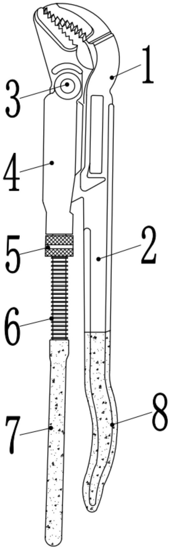 本实用新型公开了一种结构新颖的鹰嘴钳,包括上钳体和下钳体,下钳体包括握把和套铁,套铁的一端插接有销轴,且套铁通过销轴与握把之间呈活动连接,握把的一端开设有下钳齿,且上钳体的一端开设有上钳齿,上钳体远离上钳齿的另一端弯折有弯折部,且上钳体位于上钳齿与弯折部之间一侧外壁的中心处开设有贯穿上钳体的钳槽,弯折部远离上钳体的另一端焊接有丝杠。本实用新型先给上钳体施以靠紧下钳体的力,这样上钳体就可以上下自由滑动,可迅速到达合适位置,随后转动调节螺筒,调节螺筒沿螺纹连接的丝杠与套铁端口处贴合,从而实现对上钳体调节定位的目的,这样也可以快速调节鹰嘴钳的开口量,操作简单,可以节省很多时间。