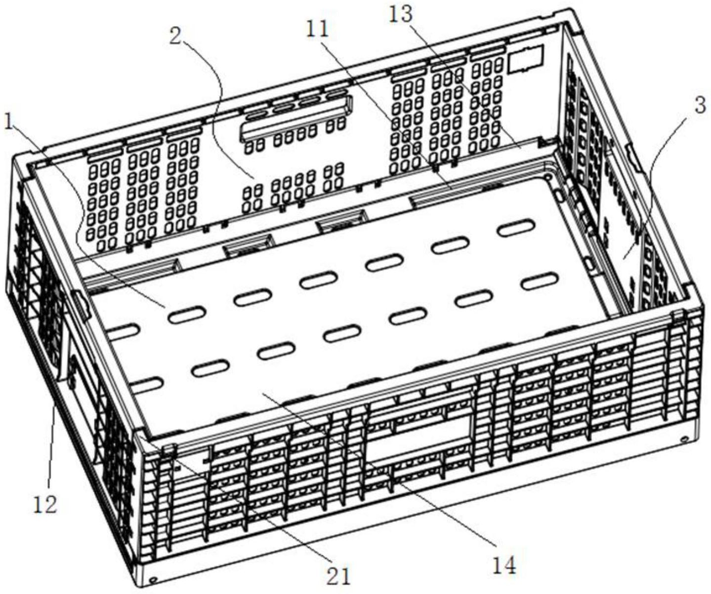 本实用新型提供一种折叠周转筐,包括:底板、长侧板和短侧板。其中:底板呈矩形,具有两个长侧边和两个短侧边,两个长侧边的上方均成型有连接凸条;长侧板有两个,长度与长侧边的长度基本相同,可转动地安装在连接凸条上;长侧板的两端设有与之垂直的转角连接板;短侧板有两个,长度与短侧边的长度基本相同,可转动地安装在短侧边上;短侧板通过活动连接结构与转角连接板可拆卸连接;底板的宽度大于等于两个长侧板的高度;底板的长度大于等于两个短侧板的高度。本实用新型的折叠周转筐,通过活动连接结构快速解除长侧板和短侧板之间的连接关系,将短侧板和长侧板折叠在一起,减少对周转筐的损坏,增加周转筐的使用寿命,减少空载运输成本。