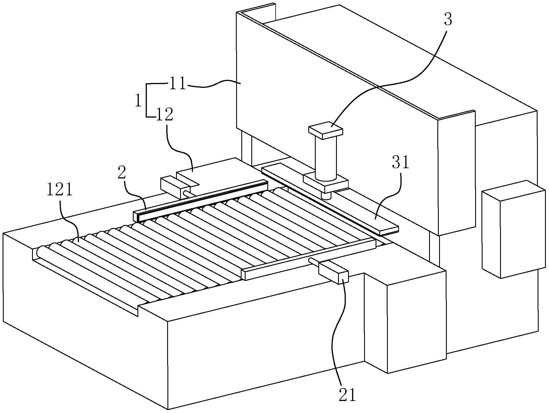 本申请涉及一种剪板机的固定装置,剪板机本体包括机体,机体一侧设置有工作台,工作台上设置有若干滚筒,所述滚筒两侧分别设置有将板材进行规整的杆体,杆体远离滚筒一侧设置有驱动杆体移动的驱动件,所述机体靠近所述工作台一侧设置有将板材进行按压的按压组件。本申请具有使板材能够较规整的进行放置的效果。