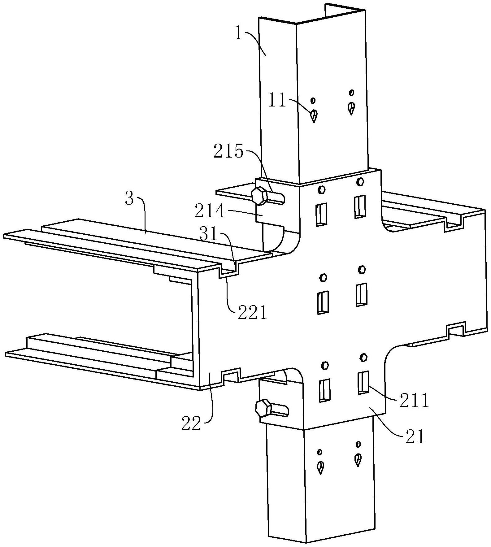 本申请涉及一种用于驶入式货架的牛腿梁结构,涉及仓储物流设备领域,其包括立柱、紧固组件、通过紧固组件安装在立柱上的牛腿架、通过紧固组件安装在牛腿架上的载重梁,所述牛腿架包括与立柱相贴合的竖板、分别固设在竖板沿其宽度方向的两端的侧支撑架,所述竖板靠近立柱的侧面上固设有挂钩,所述立柱上开设有与挂钩相适配的第一安装孔,所述挂钩钩挂在第一安装孔内,所述侧支撑架的顶端和底端分别开设有第二长圆孔,所述载重梁通过紧固组件安装在第二长圆孔处。本申请具有负载不同尺寸和强度的载重梁并提高牛腿梁的承载力的效果。