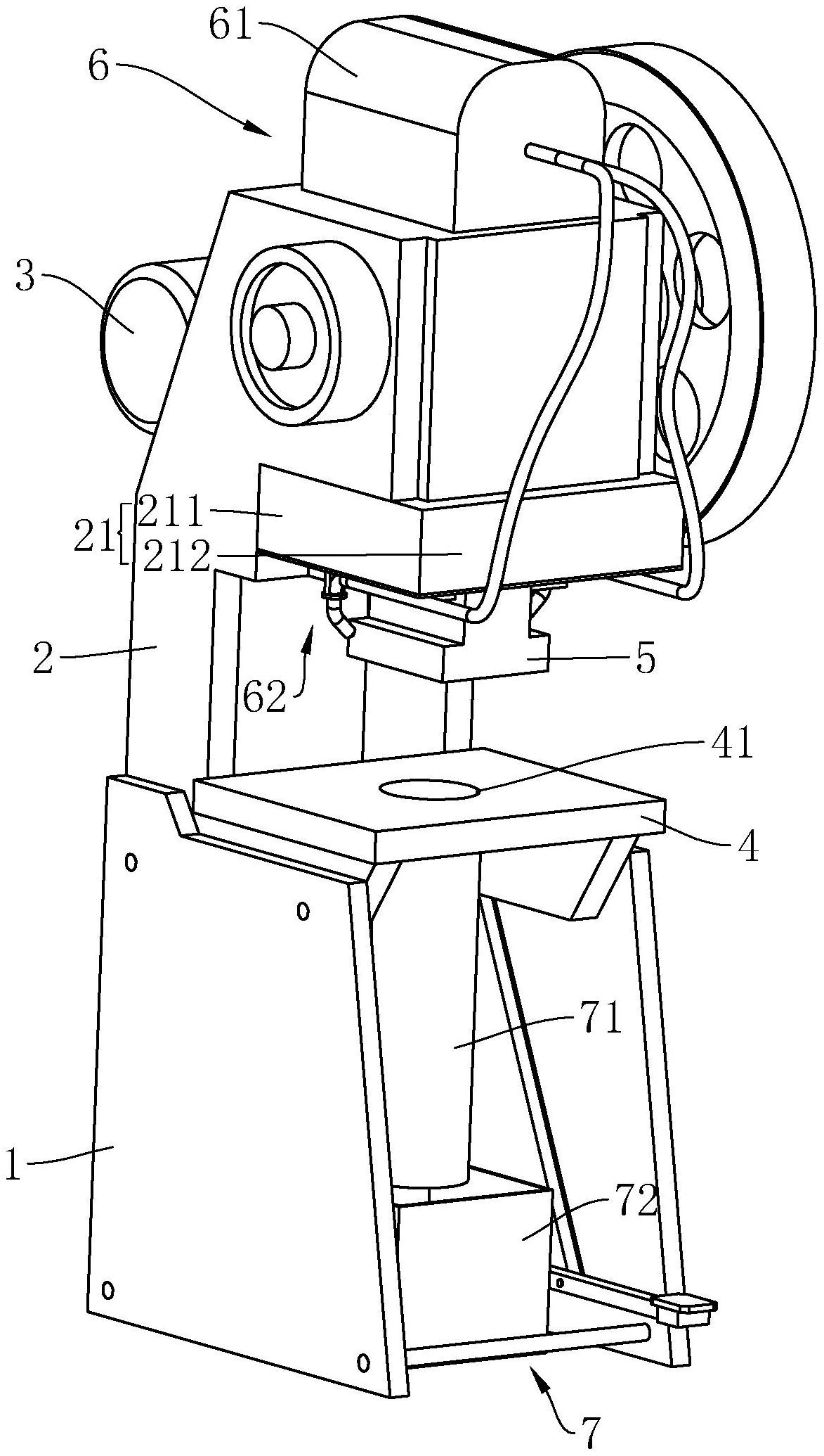 本申请涉及一种冲压式压力机的自动除渣装置,涉及冲床设备技术领域,其包括工作台、冲压座、机架、第一电机、冲头,所述机架的顶端固设有风机,所述风机一端固设有排风管,所述机架底面上固设有内部中空的第一固定板,所述第一固定板内设置有除渣组件,所述除渣组件包括螺杆、喷嘴,所述第一固定板内固设有第二电机,所述螺杆上套设有与其螺纹连接的滑块,所述滑块的底端固设有用于放置喷嘴的连接架,所述第一固定板底面上开设有沿其长度方向设置的孔道,所述喷嘴位于孔道外,所述排风管远离风机的一端与喷嘴固定连接且相连通,所述第一固定板内设置有用于限制滑块移动的限位组件。本申请具有提高清除边角料的效率的效果。