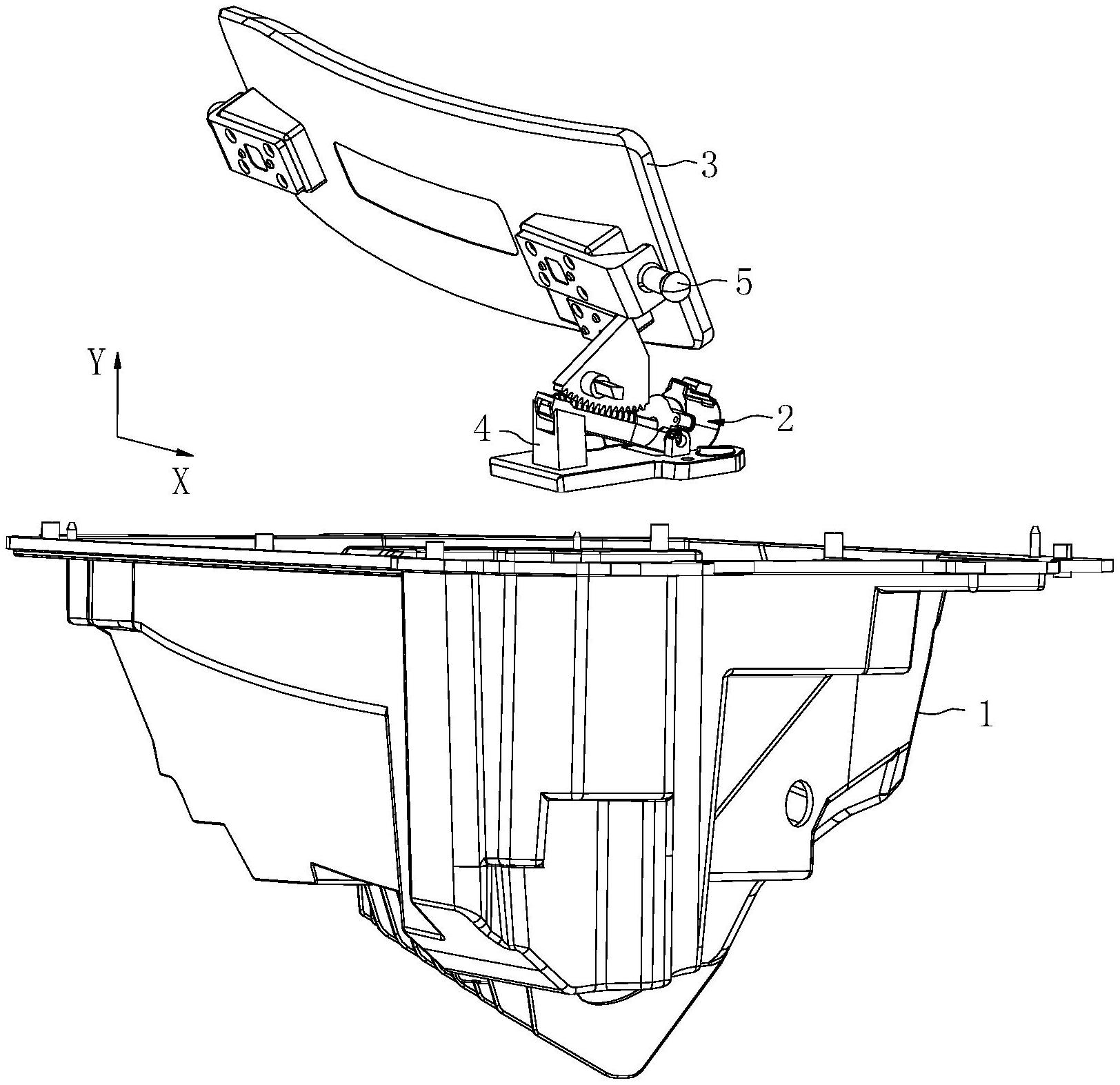 本实用新型涉及一种曲面镜调节装置,包括机架、驱动机构、复位件和限位件,驱动机构设置在机架上,驱动机构包括电机、蜗杆和蜗轮,电机与蜗杆传动连接,蜗轮与蜗杆啮合,蜗轮设置在曲面镜上;复位件位于驱动机构与机架之间,复位件始终具有驱动蜗杆沿第一方向移动的趋势,以使蜗杆与蜗轮始终啮合;限位件安装在机架上,限位件用于限制驱动机构沿第二方向摆动,第二方向与第一方向呈夹角设置。本实用新型的曲面镜调节装置通过设置复位件和限位件,使蜗杆始终与蜗轮保持啮合,有效避免在调节曲面镜过程中因为蜗杆和蜗轮间隙过大而产生卡滞的问题,增大蜗轮和蜗杆配合的容许公差,降低蜗轮和蜗杆的加工精度,节省生产成本。