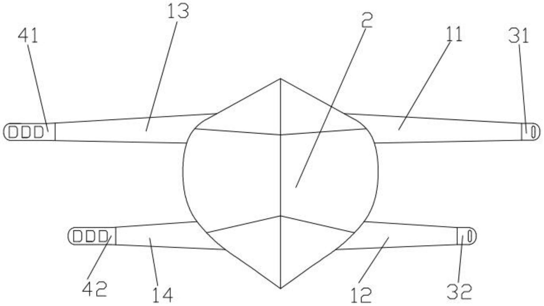本实用新型公开了一种挂钩式口罩绑带,绑带主体由左绑带和右绑带组成,左绑带由左上绑带和左下绑带组成,右绑带由右上绑带和右下绑带组成,左绑带与右绑带之间设置有口罩主体,左绑带与右绑带对立设置在口罩主体的两侧,左绑带、右绑带分别与口罩主体固定缝合,左绑带的一端设置有挂孔,右绑带的一侧设置有挂钩,通过挂钩与挂孔的设计形状契合进行固定,佩戴更加舒适,可以自由调节绑带松紧度,脸部不易出现勒痕,且不易脱落走位;口罩主体采用挂钩式的结构设置,尤其能够克服长发人士佩戴头戴式口罩的缺陷,使用更为方便。