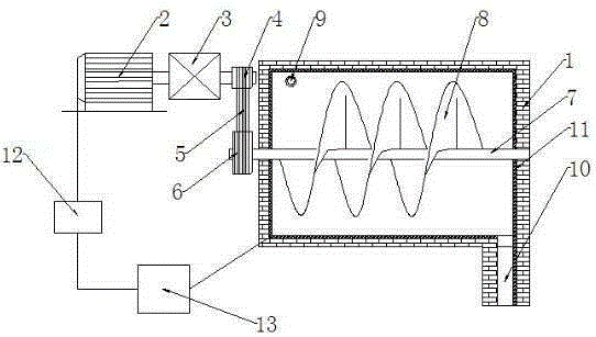 本实用新型涉及食品加工领域,具体为一种核桃酱加工生产中的搅拌装置;包括搅拌容器和搅拌总成,搅拌容器设置有进料口和出料口,搅拌总成包括位于搅拌容器外的动力输出机构和位于搅拌容器内的搅拌机构;还包括设置于搅拌容器内壁上的加热装置,其中加热装置与控制器相连接,其中控制器还与电流传感器相连接,其中电流传感器还与电机相连接;本实用新型对于半固态或液态食品搅拌,加热可以产生辅助搅拌的作用,因此可以降低驱动机构的负荷,降低其工作电流,避免其过负荷工作不但提高了工作效率,使得物料搅拌更为充分,混合更为均匀,特别于将物料的液相和固相均质化,保证了食品的味道纯正。