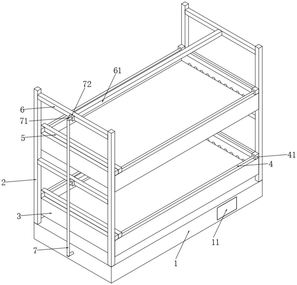 本实用新型涉及培养床技术领域,具体地说,涉及一种有利于基质排水、翻松及施肥的苗木培养床,包括底座,底座的顶面四个拐角均安装有安装柱,左右两侧相对立的安装柱之间设有若干培养床,培养床的顶面设有培养槽,培养槽的右侧壁靠近底端规则分布有若干通孔,培养床的顶面前后侧均安装有电动滑杆,两个电动滑杆之间滑动连接有电动滑板,电动滑板的底面规则分布有若干松土齿;该有利于基质排水、翻松及施肥的苗木培养床通过电动滑杆、电动滑板和松土齿的配合能够对培养槽内的培养土起到翻松的作用,有利于苗木的生长,同时设置在培养槽一侧底端的通孔和收集盒便于培养槽内部的基质的排水,进一步地增强了苗木的生长效果。