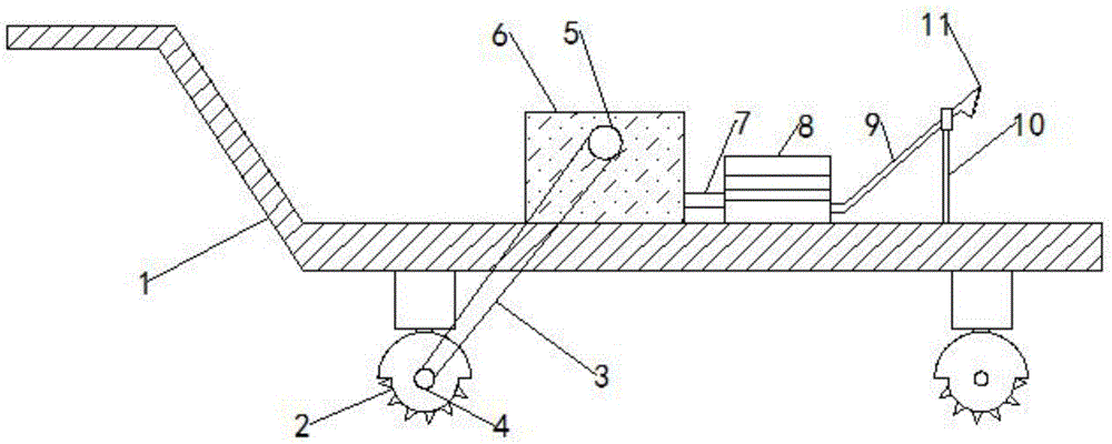 本实用新型涉及兰花种植的技术领域,具体是一种兰花种植用施肥机构,包括齿轮与混合槽,齿轮的中间固定安装有小转轮,混合槽的表面中间固定安装有大转轮,小转轮与大转轮之间活动连接有皮带。通过设有小转轮与大转轮,通过皮带进行连接,在推动推车移动的同时,齿轮带动小转轮转动,小转轮通过皮带带动大转轮转动,大转轮带动混合槽内部的转轴转动,使搅拌网对内部的养料与水进行持续搅拌,随着齿轮的移动,搅拌网会一直转动,有效对养料与水进行混合;且通过将软管设为PVC管型,且其为可拉伸型,将喷头设置为头朝下的扇形结构,可在最大程度将肥料喷向兰花的根部,避免过多的肥料对兰花的叶面造成损坏,降低农户的种植成本。