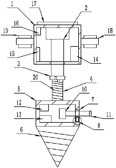 本实用新型公开了一种土壤深层取样装置,包括圆柱形盒体,所述圆柱形盒体内上表面设有旋转端向下的旋转电机,所述旋转电机旋转端上设有连接块,所述连接块下表面上设有辅助杆,所述辅助杆下表面上设有取样块,所述取样块下表面设有钻头,所述连接块与辅助杆、辅助杆与取样块和取样块与钻头均采取卡扣式固定连接,所述取样块内设有无线接收模块和微型电池,所述圆柱形盒体内设有蓄电池、控制器和无线发送模块,所述圆柱形盒体上表面上设有电容触摸屏,所述蓄电池分别与控制器、无线发送模块、无线接收模块、电容触摸屏、旋转电机、微型电池、旋转档门和直线电机电性连接。本实用新型的有益效果是,结构简单,实用性强。