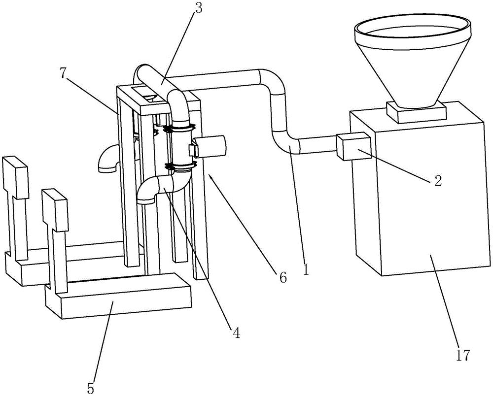 本实用新型涉及一种馅料搅拌机,更具体地说,它涉及一种馅料搅拌机的出料收集装置,其技术方案要点是:包括用于连接在馅料搅拌机出料口处的输料管以及设置在输料管处用于将搅拌机内馅料抽出的抽料泵,所述输料管端部连接有连接管,所述连接管两端均设置有出料管,两个所述出料管下方均设置有电子秤,所述连接管两端与两个出料管之间分别设置有启闭阀。本实用新型的一种馅料搅拌机的出料收集装置具有提高馅料收集效率的优点。