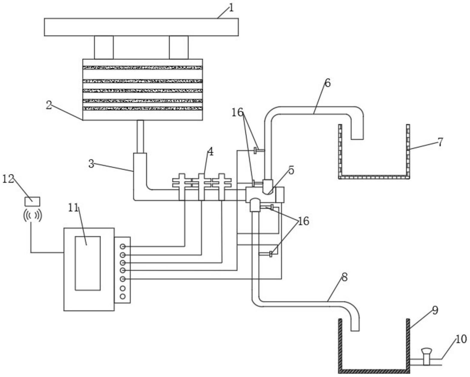 本实用新型涉及道路工程技术领域,具体涉及一种桥面径流危化品监测控制装备,包括桥梁、过滤箱和径流控制机构,桥梁底部与过滤箱上端的两组第一排水口连接;滤网,其呈纵向等距分布设置于过滤箱的内部;压力表,其分别安装于径流控制机构的第二法兰连接口、第三法兰连接口的一侧。通过设置过滤箱,桥面径流向下会先经过过滤箱,通过过滤箱对液体进行初步过滤将大颗粒杂质过滤,为后续流程提高一定保障,防止管道内杂质过多发生堵塞影响后续监测,并且该装置在径流控制机构与分流管道的连接端均设置有压力表,同时分流管道设置有压力表。通过比对流体液压数据可判断管道是否发生堵塞以及管道连接处的密封性是否发生漏水现象。