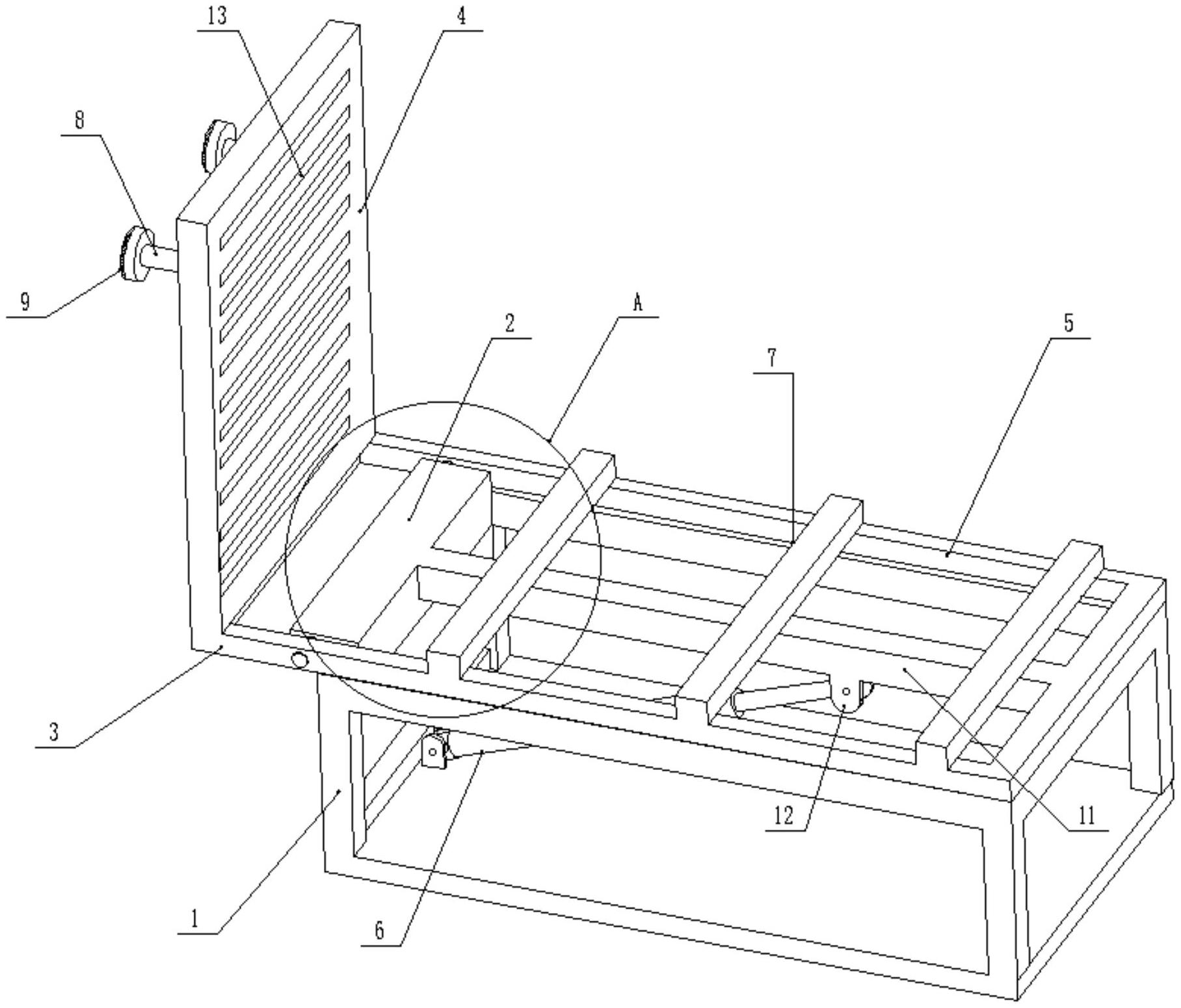 本实用新型公开了一种板类建筑构件翻转装置,包括:安装架,所述安装架的一侧连接有一支出端;翻转架,所述翻转架包括垂直连接的第一支撑板和第二支撑架,所述第二支撑部固定有若干支撑梁,所述第一支撑板的底面固定有支撑腿,所述第二支撑架的左侧长度超过安装架,第二支撑架通过安装架的支出端铰接连接在安装架上;翻转气缸,所述翻转气缸的底部通过一铰接座铰接在安装架上,该翻转气缸的顶部铰接在第二支撑架的中部。该翻转装置结构简单,能够使得成型硬化后的建筑构件快速的被放置,然后进行翻转,方便后续通过叉车进行转运。