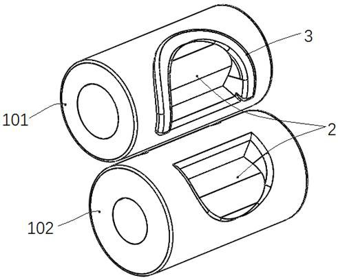 本实用新型提供一种新型成型模具及成型组件,其中成型模具包括本体,在本体上开设有成型槽,在本体上位于成型槽槽口处固设有凸边。成型组件包括并列设置且间隙配合的第一压辊和第二压辊,在第一压辊和第二压辊上相对应的位置均设置有成型槽,在第一压辊上位于成型槽槽口处的位置固设有凸边,凸边的厚度小于第一压辊和第二压辊之间的间隙。成型模具中成型槽的槽口处设置凸边,结构简单且方便加工,注馅食品成型效果好。成型组件中设有凸边的第一压辊和没有设置凸边的第二压辊间隙配合,结构简单,方便生产,成本低,成型效果好。