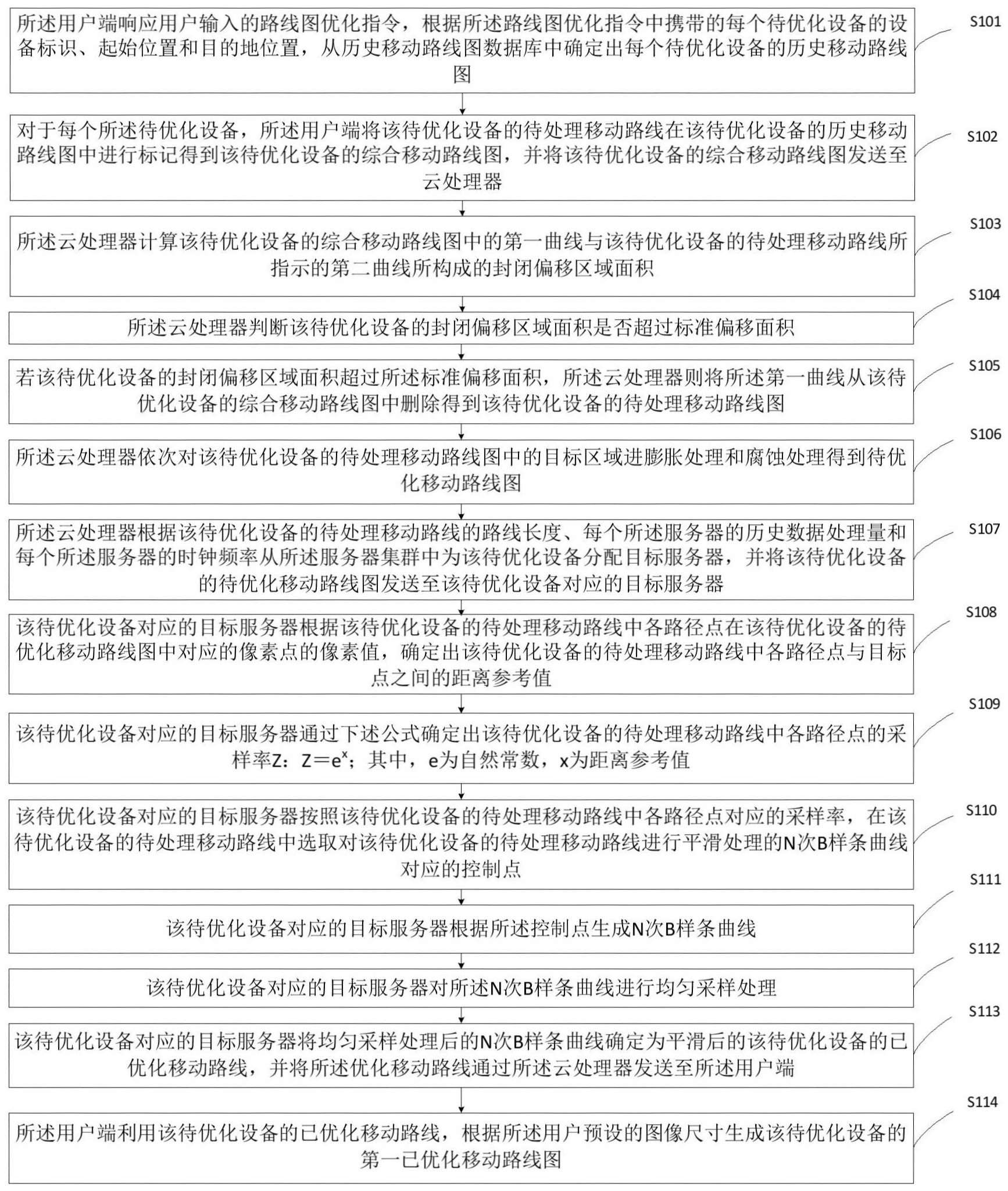 本申请提供了一种路线图优化方法、系统、计算机设备及可读存储介质,其中,用户端根据待优化设备的待处理移动路线和数据库中的历史移动路线图生成综合移动路线图;云处理器计算待处理移动路线指示的第一曲线和历史移动路线指示的第二曲线构成的封闭区域面积并根据封闭区域面积判断待处理移动路线是否需要优化;在进行路线图优化前为每个待处理移动线路分配服务器,由该服务器根据待处理移动线路与综合移动路线图中的其他待优化设备的位置对待处理移动线路进行优化得到已优化移动线路;最后用户端根据已优化移动线路生成优化后的线路图。采用上述方法,以降低在进行路线图优化时所需耗费的人力成本,同时提高优化后的线路的准确性和适配性。