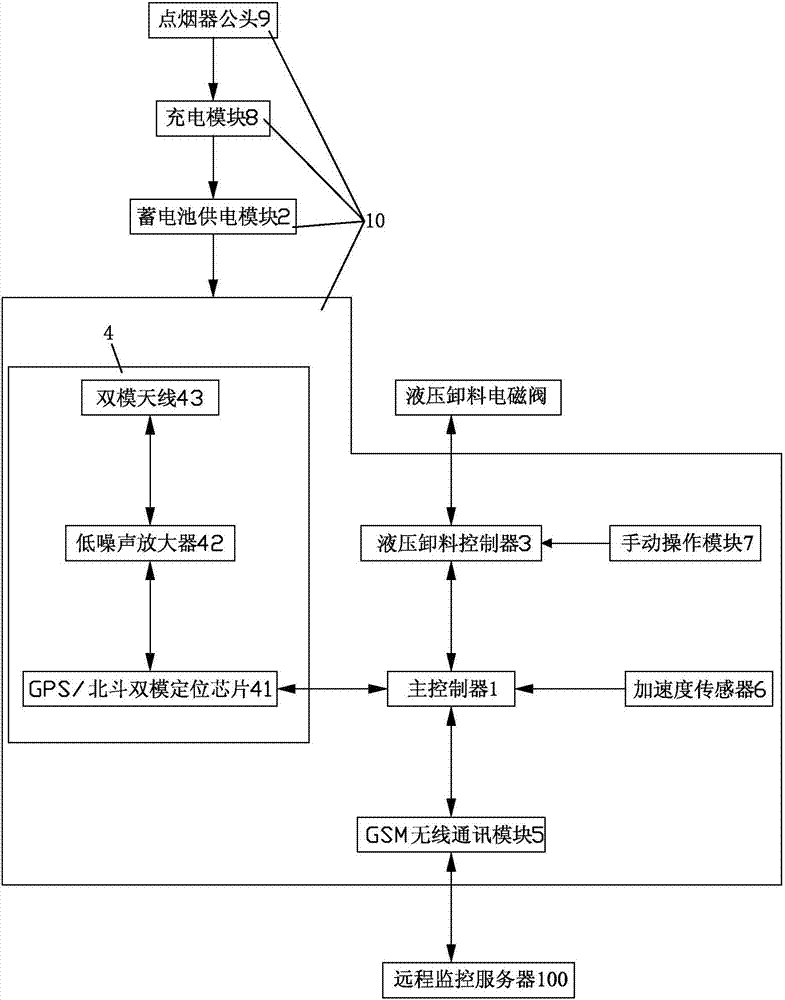 本实用新型公开了一种用于带液压卸料装置的货车的监控系统,包括有远程监控服务器和设置在货车上的车载监控终端,车载监控终端包括有主控制器和用于车载监控终端供电的蓄电池供电模块,主控制器上电连接有用于控制液压卸料电磁阀通断的液压卸料控制器、用于检测货车位置信息的双模定位模块、用于将液压卸料电磁阀工作信息和货车位置信息发送给远程监控服务器以及接收远程监控服务器信息的GSM无线通讯模块、以及用于检测货车是否运动以便于主控制器控制双模定位模块进入定位模式/省电模式的加速度传感器,液压卸料控制器上电连接有用于手动控制液压卸料电磁阀通断的手动操作模块。本案结构简单易实现,便于货车卸料监控。