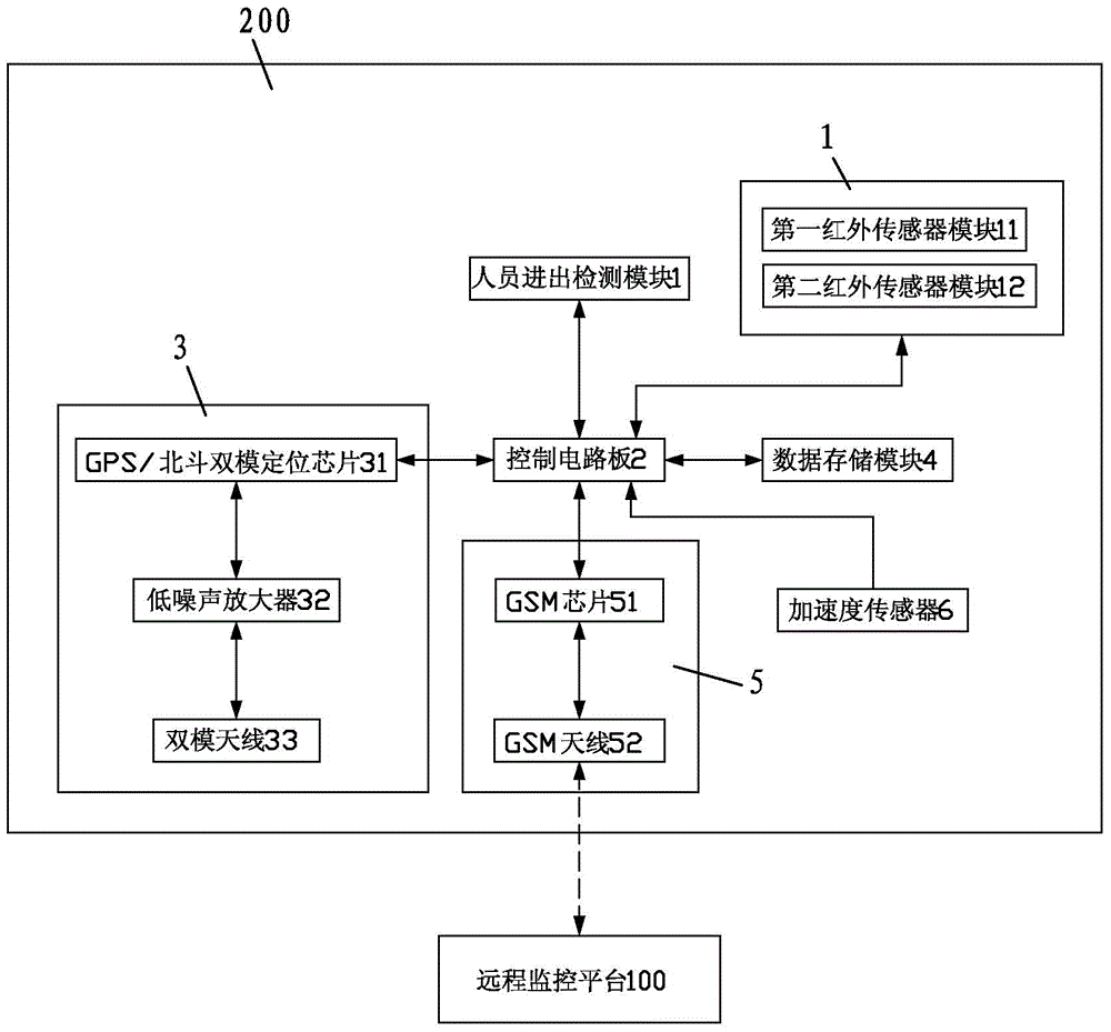 本实用新型公开了一种客车用的监控系统,包括有远程监控平台和用于设置在客车上的监控终端,监控终端包括有个人员进出检测模块和控制电路板,每个人员进出检测模块包括有依次设置在客车上车门口通道中以便于控制电路板根据其先后触发顺序来判断人员进出动作的第一红外传感器模块和第二红外传感器模块,控制电路板上还连接有用于检测客车位置信息的双模定位模块、数据存储模块、以及用于将客车上人员数量信息和客车位置信息发送给远程监控平台的GSM无线通讯模块,双模定位模块包括有顺次连接在控制电路板上的GPS/北斗双模定位芯片、低噪声放大器、以及双模天线。本案结构简单易实现,实用性好。