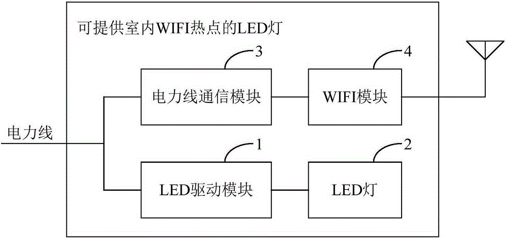 本实用新型涉及无线通信技术领域,尤其涉及一种可提供室内WIFI热点的LED灯。在本实用新型的实施例中,所述可提供室内WIFI热点的LED灯包括LED驱动模块和LED灯,所述LED驱动模块的输入端和输出端分别接电力线和所述LED灯,所述可提供室内WIFI热点的LED灯还包括电力线通信模块和WIFI模块,所述电力通信模块的输入端和输出端分别接电力线和所述WIFI模块。本实用新型的实施例在现有LED灯的基础上增加了电力线通信模块和WIFI模块,不需重新布线,在不破坏原有装修的情况下,实现了无线网络轻松接入,增加了无线网络连接的稳定性,且节约了成本。