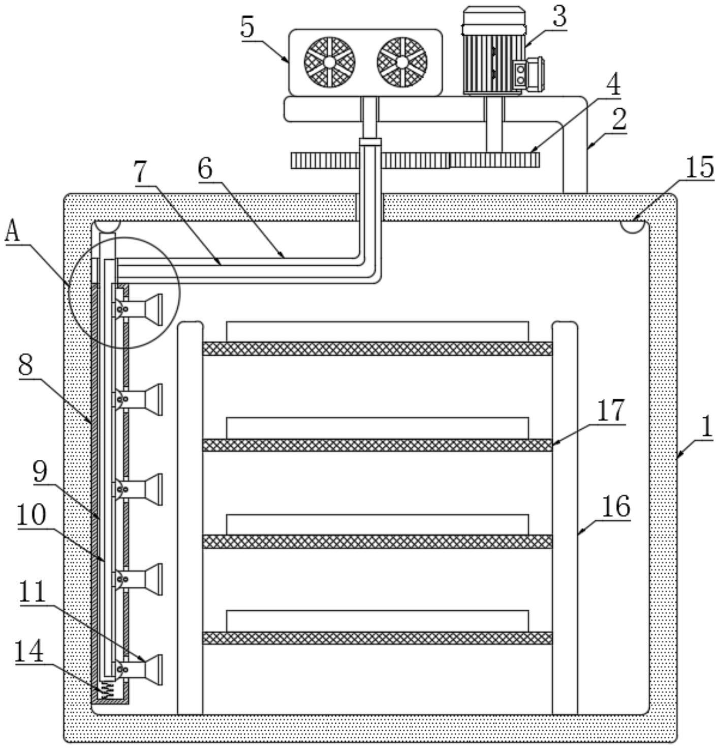 本实用新型公开了一种中高密度纤维板生产用木质纤维干燥系统,包括烘干箱,所述烘干箱的内底部固定连接有两个安装板,两个所述安装板相对的侧壁共同固定连接有多个放置网,所述烘干箱的上侧固定连接有支撑架,所述支撑架的上侧固定连接有烘干机,所述烘干箱的内部设有用于对纤维板进行烘干的烘干机构。本实用新型结构设计合理,能够防止纤维板堆积在一起影响其烘干效果,且利用放置网使得热风能与纤维板的下侧相接触,其次能够实现改变风向的目的,使得每一层的纤维板的上侧与下侧均能与热风充分接触,保证成品的质量,大大提高了工作效率。