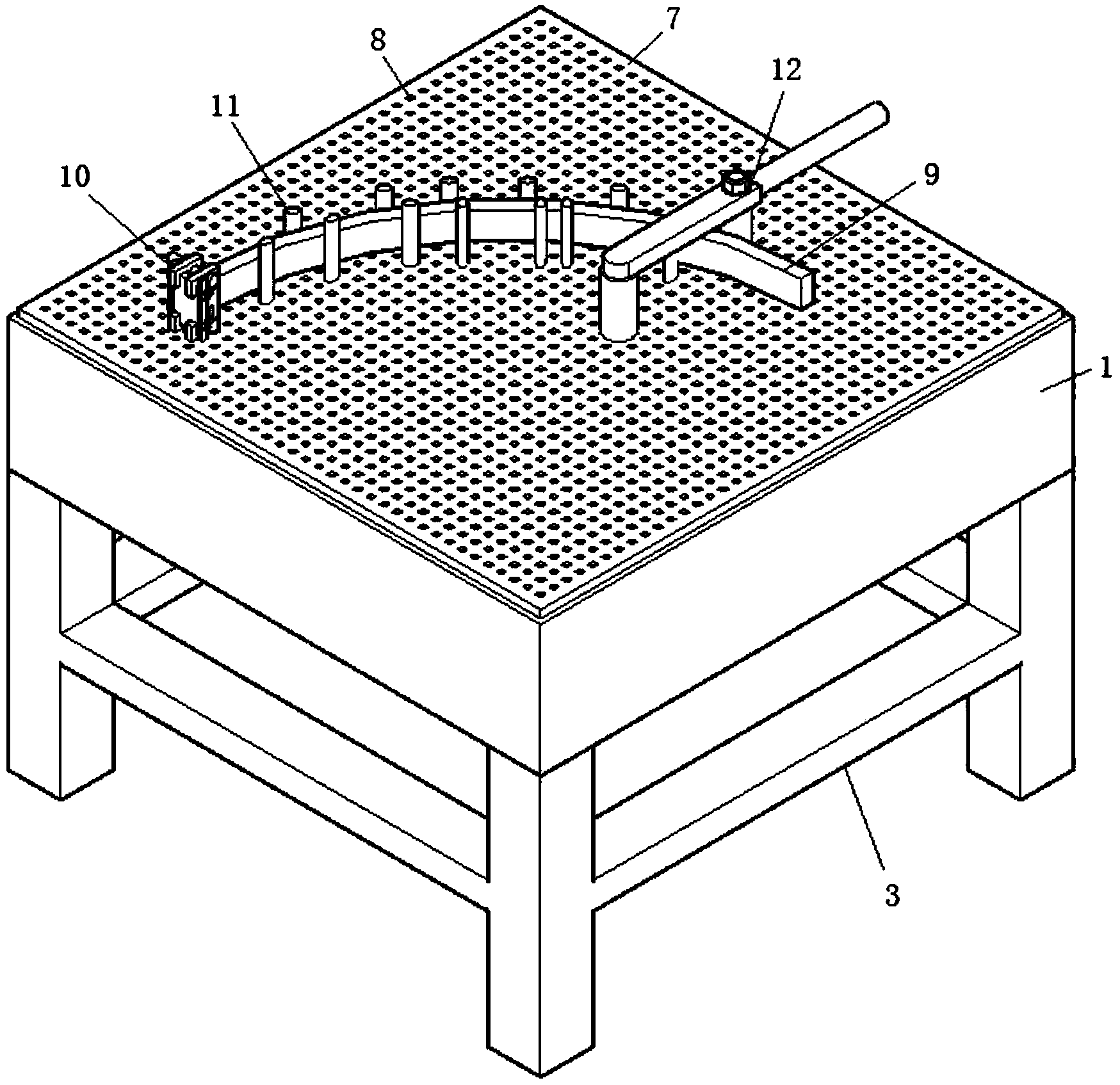 本实用新型涉及一种办公家具生产用板材弯曲造型机,包括蒸汽发生器、多孔板、夹具、弯曲组件、定位柱、蒸汽箱、蒸汽箱盖,蒸汽发生器通过管道与设置在蒸汽箱底端的蒸汽入口连通,多孔板安装在设置于蒸汽箱顶部的卡槽中,多孔板上设置有若干个按照矩形阵列排布的插孔,夹具、弯曲组件、定位柱均通过设置在各自底部的插接柱可拆卸的插接在插孔中。本实用新型的有益效果是:将多孔板安装在能够通入蒸汽的蒸汽箱中,在板材弯曲的过程中,使用蒸汽间歇性的对板材进行熏蒸,增加板材的湿度和温度,进而增加板材的柔韧度,降低板材在弯曲过程中被折断的可能性;采用定位柱对板材进行定位,便于对板材的弯曲造型进行控制、固定。
