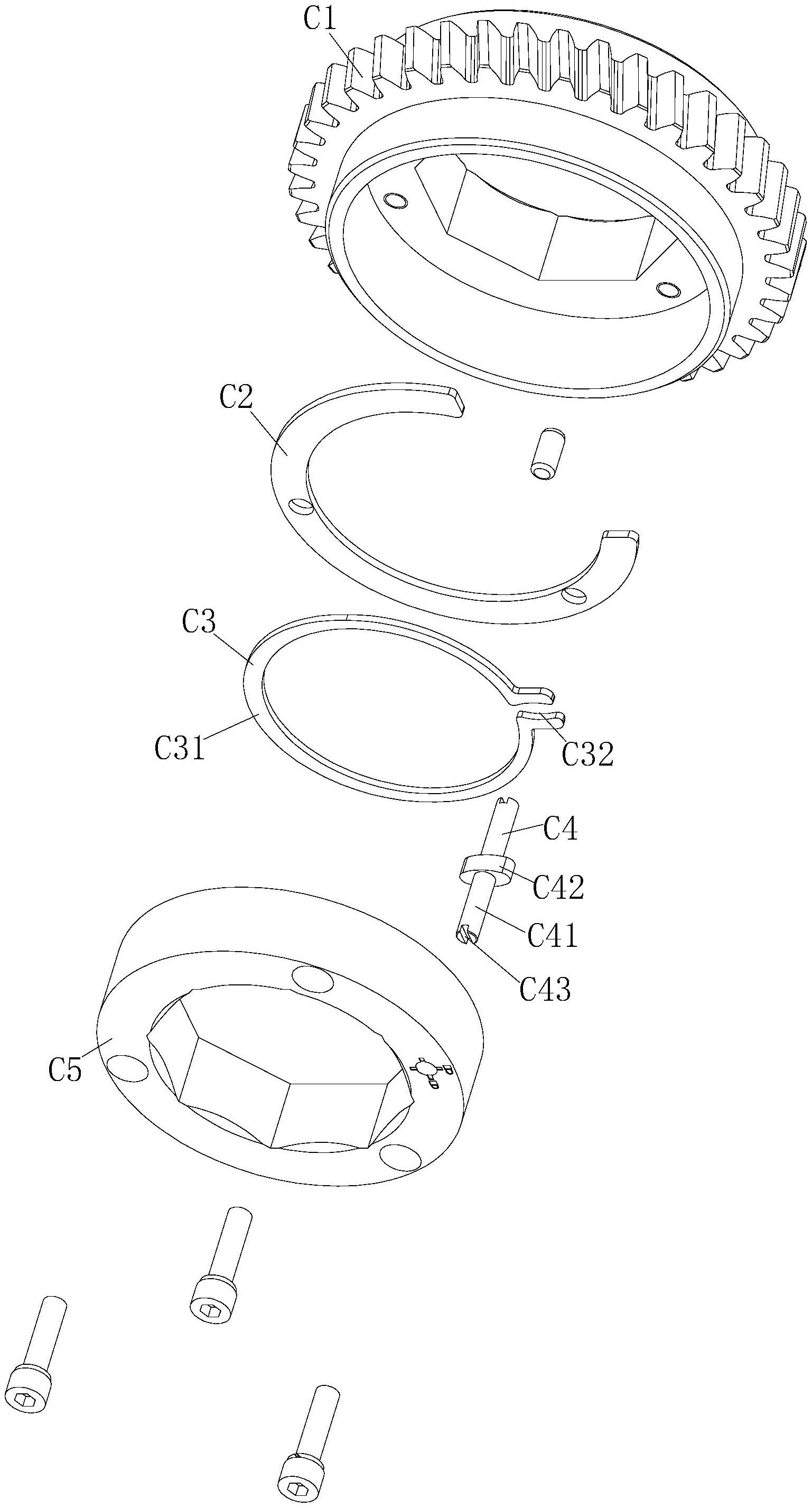 本实用新型涉及一种锂电手持式套丝机的齿盘组件,属于外螺纹加工设备领域;主要用于燃气、建筑、石油和化工等行业的管道连接中的维修,另也可做为野外动力驱动设备使用。本实用新型包括一号齿盘、衬垫、一号挡圈、偏心轴和内八角,所述一号挡圈和内八角均安装在一号齿盘上,所述衬垫套装在一号挡圈外,所述偏心轴的两端分别安装在一号齿盘和内八角上,所述一号挡圈与偏心轴配合,所述一号挡圈包括一号挡圈本体和挡圈开口,所述挡圈开口设置在一号挡圈本体上,所述偏心轴包括偏心轴本体和偏心轴凸块,所述偏心轴凸块设置在偏心轴本体上、且偏心轴凸块位于挡圈开口内,所述偏心轴本体的端部设置有偏心轴槽。